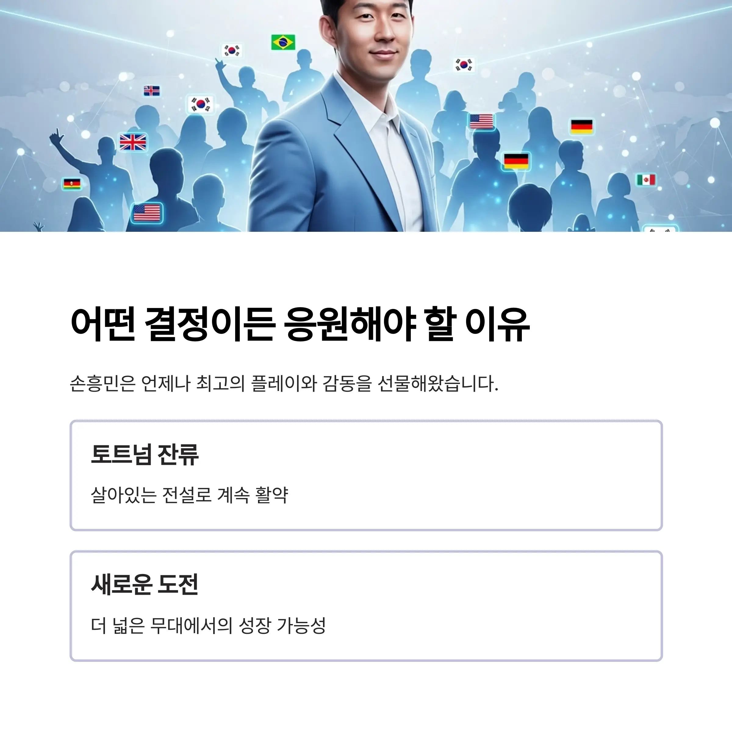 손흥민 선수는 언제나 우리에게 최고의 플레이와 감동을 선물해왔습니다. 그의 결정이 어떤 방향이든, 우리는 그의 축구 인생을 존중하고 변함없이 응원해야 할 것입니다. 토트넘에 남든, 새로운 도전을 하든, 그는 분명 앞으로도 우리를 깜짝 놀라게 할 멋진 활약을 보여줄 것이라고 저는 굳게 믿고 있습니다. 그의 독보적인 행보를 우리 모두 함께 응원해 주시기 바랍니다!