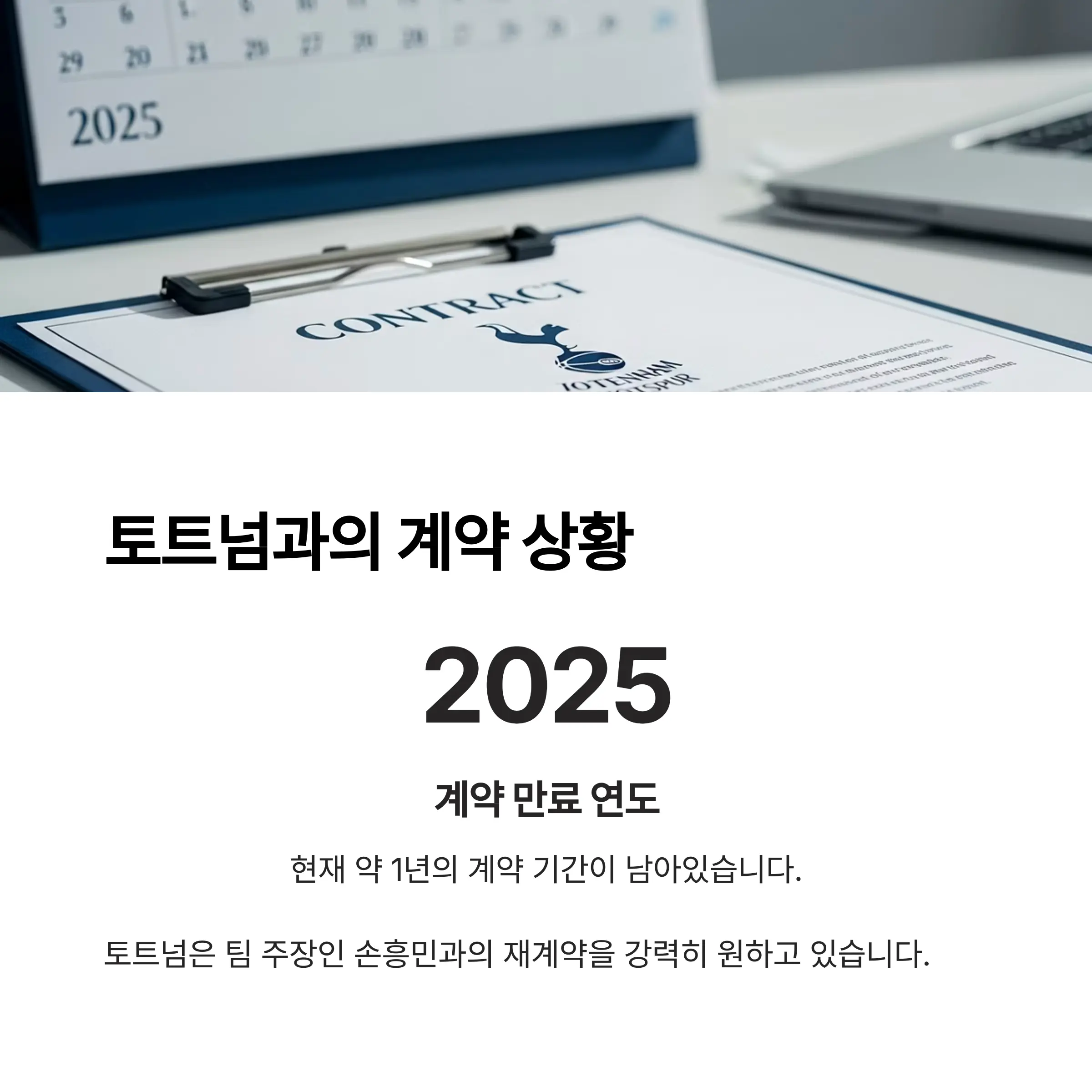 현재 손흥민 선수는 토트넘 홋스퍼와 2025년 여름까지 계약이 되어 있습니다. 즉, 아직 1년 정도 계약 기간이 남아있는 상황입니다. 축구에서는 계약 기간이 1년 정도 남으면 재계약 이야기가 나오거나, 아니면 다른 팀으로 이적할 가능성도 함께 거론되곤 합니다.