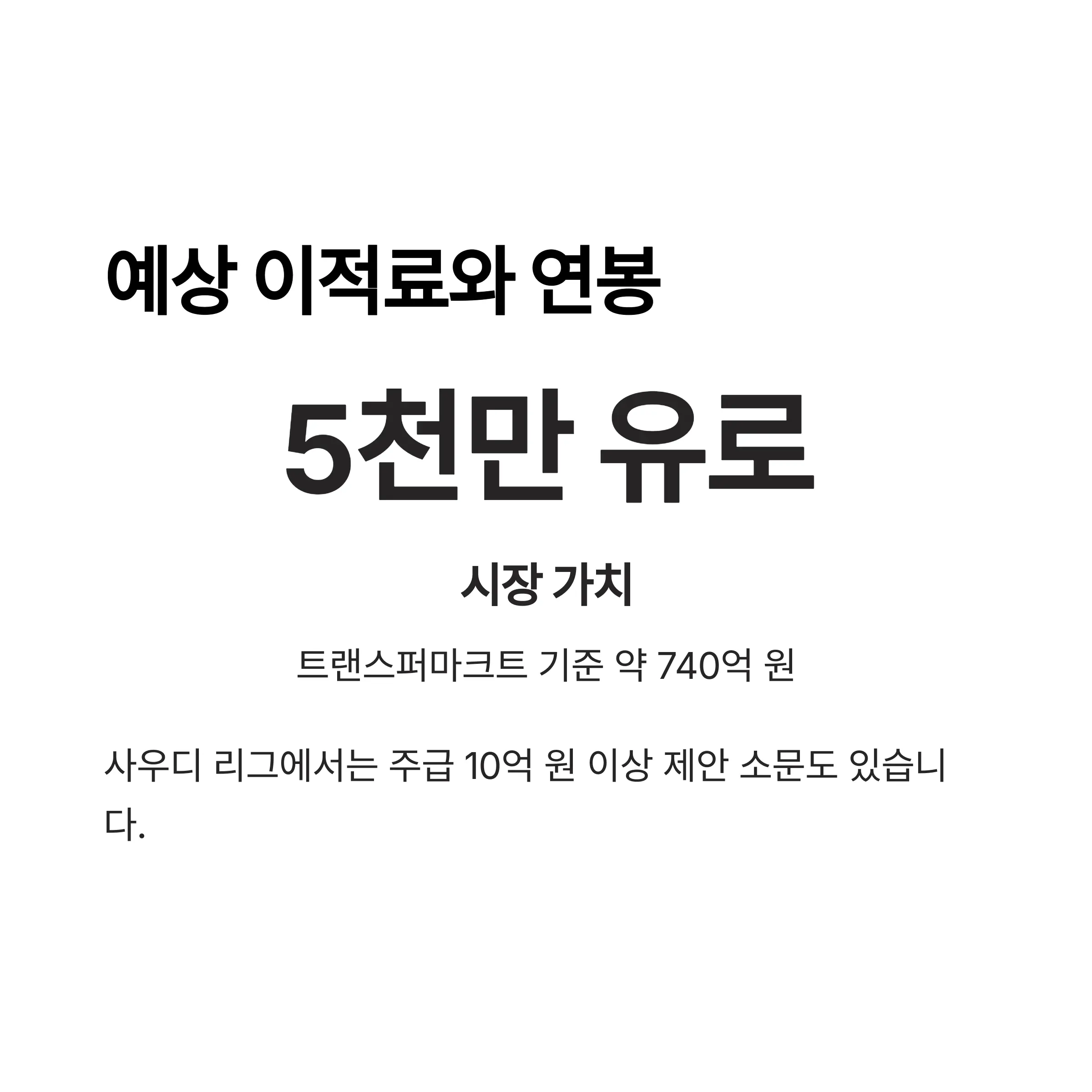 하지만 실제 이적료는 이보다 훨씬 더 높아질 수 있습니다. 특히 사우디 리그 팀들은 선수들에게 상상 이상의 연봉을 제시하는 것으로 유명한데요, 손흥민 선수에게도 주급 10억 원 이상의 제안이 있었다는 소문도 있습니다.