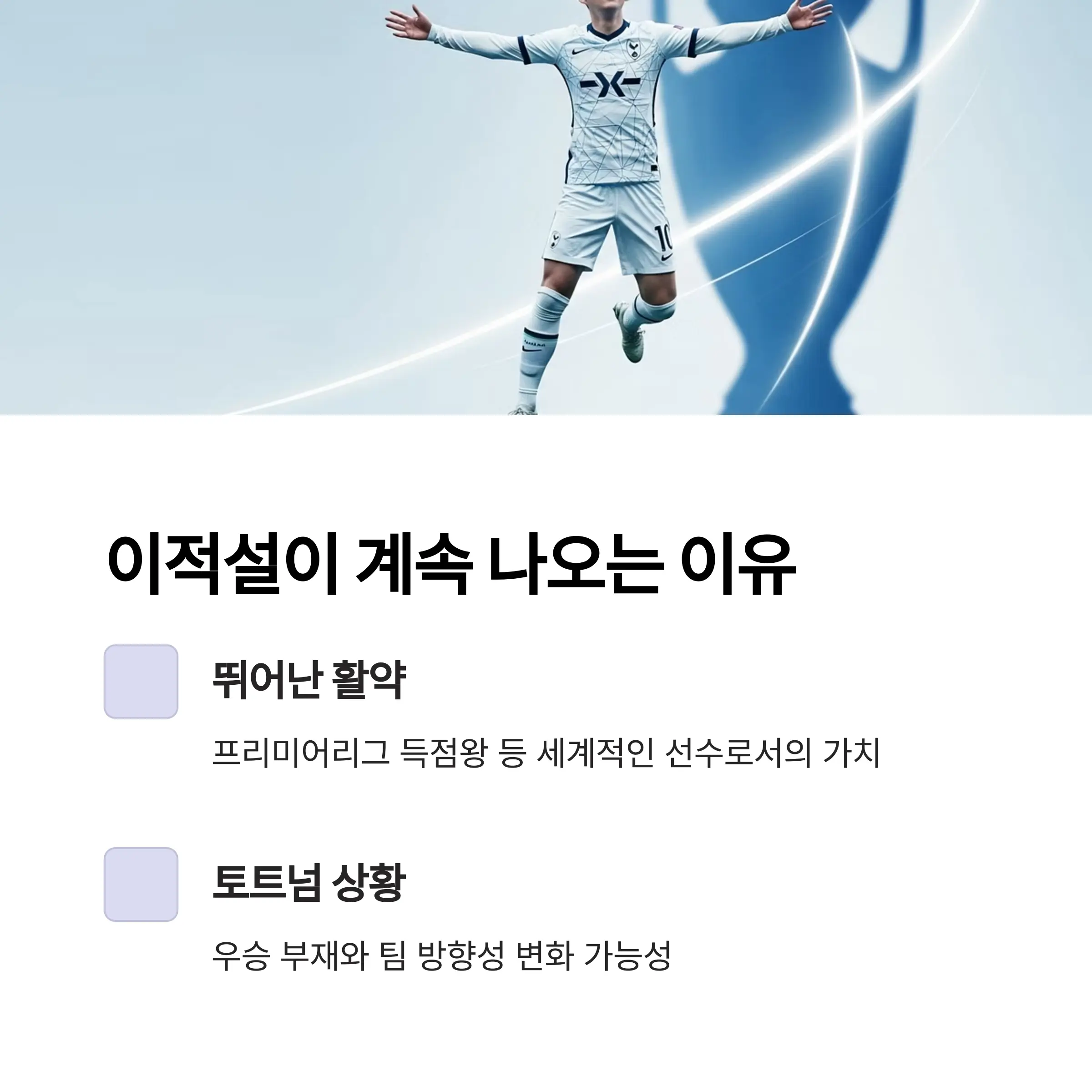 손흥민 선수의 이적설 소식은 늘 축구 팬들의 큰 관심을 받습니다. 많은 분들이 가장 궁금해하는 핵심 정보들을 먼저 자세히 알려드릴게요.