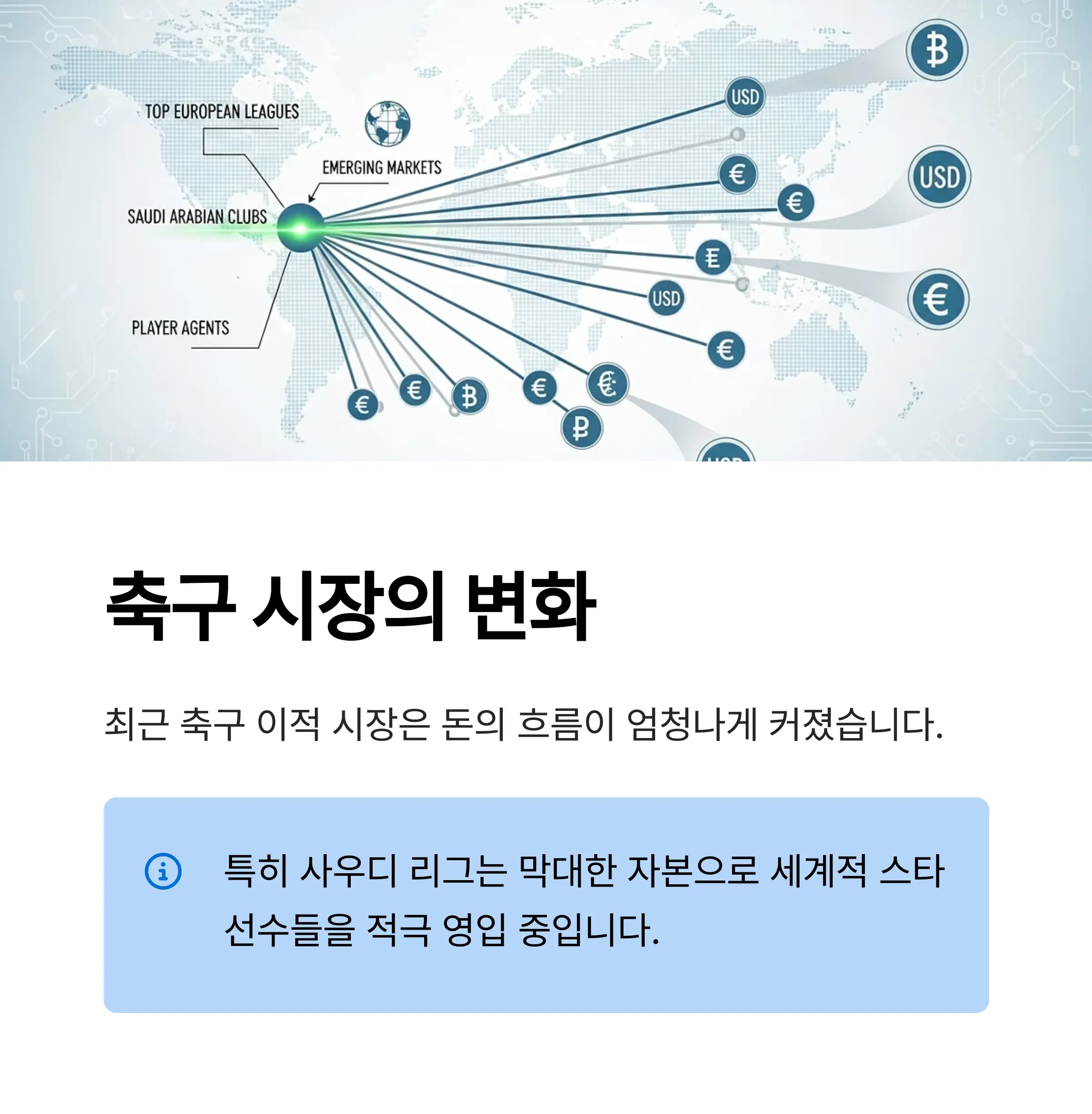 최근 축구 이적 시장은 돈의 흐름이 엄청나게 커졌습니다. 특히 사우디아라비아 리그처럼 막대한 자본을 가진 구단들이 세계적인 스타 선수들을 영입하려고 적극적으로 나서고 있습니다. 이런 큰 흐름 속에서 손흥민 선수처럼 상징적인 선수는 언제나 영입 1순위로 거론될 수밖에 없습니다. 돈의 힘이 커지면서 이적설도 더 자주, 더 크게 불거지는 경향이 있습니다.