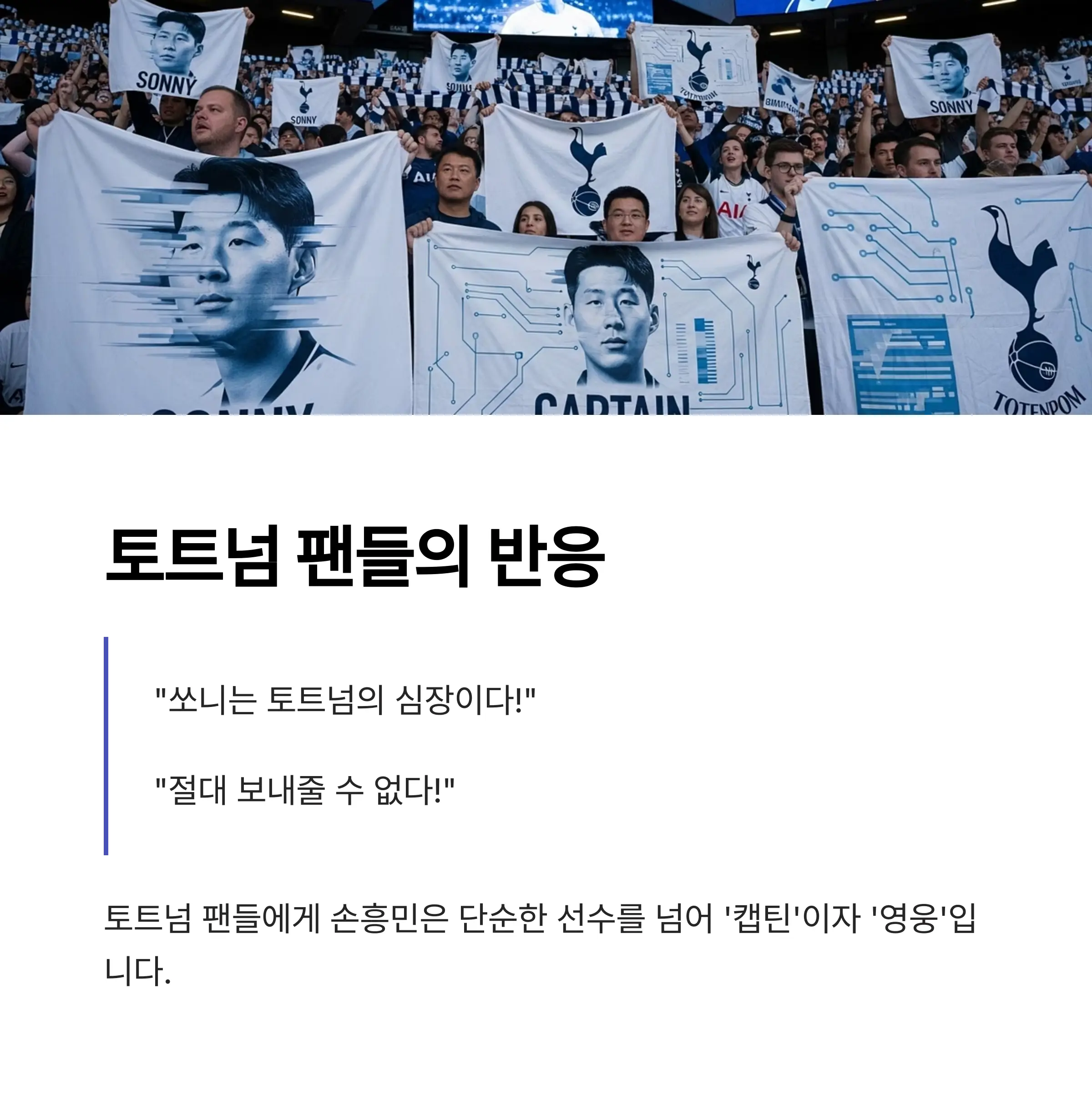경기장에서 보여주는 그의 열정과 팬들을 향한 진심은 토트넘 팬들에게 큰 감동을 주었기 때문입니다. “쏘니는 토트넘의 심장이다!”, “절대 보내줄 수 없다!” 같은 뜨거운 응원의 목소리가 많습니다.