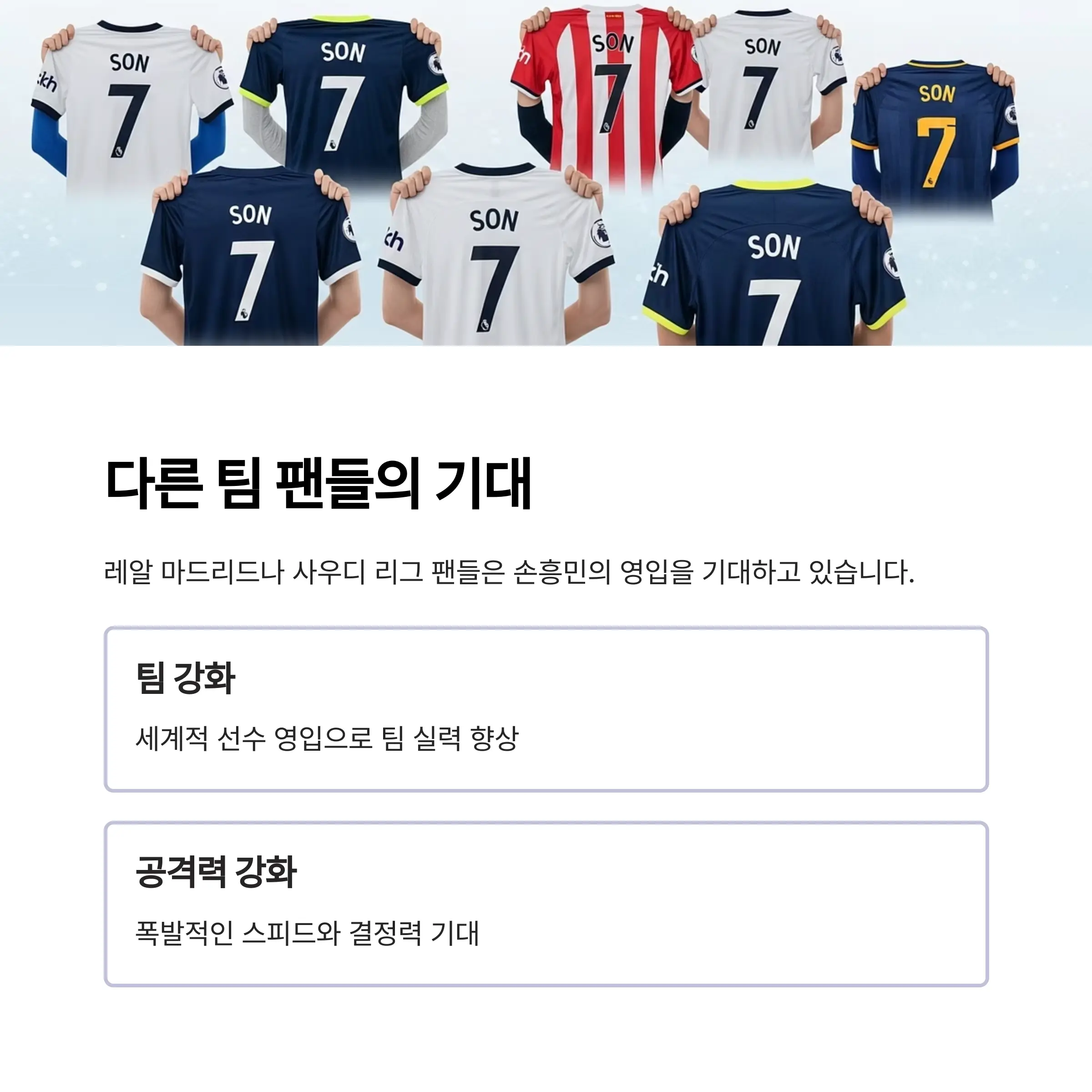 반대로 레알 마드리드나 사우디 리그 팀의 팬들은 손흥민 선수가 자기 팀으로 와주기를 바라는 마음이 클 것입니다. 세계적인 선수가 온다면 팀의 실력도 훨씬 강해지고, 인기도 더 많아질 것이기 때문입니다. 특히 공격적인 플레이를 좋아하는 팬들은 손흥민 선수의 폭발적인 스피드와 결정력을 자기 팀에서 보고 싶어 할 것입니다.