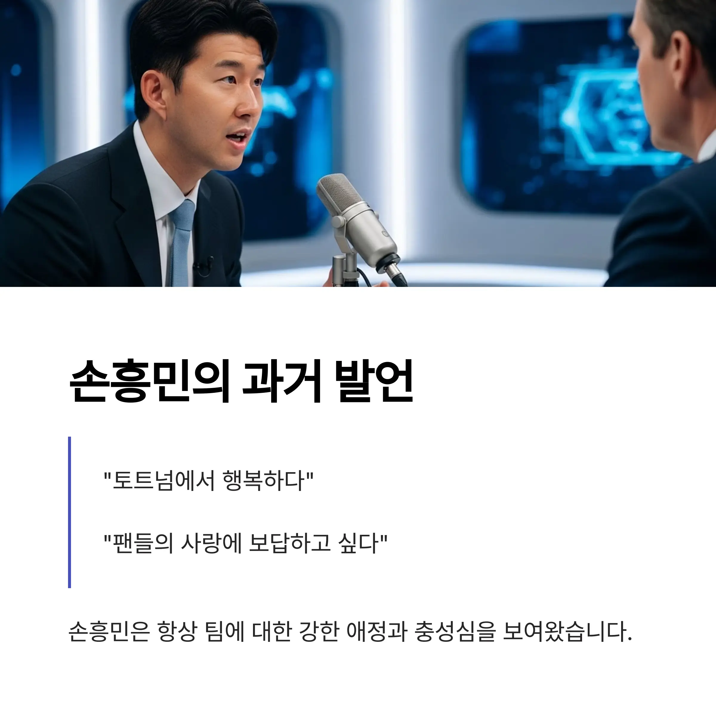 그렇다면 손흥민 선수 본인은 이 이적설에 대해 어떻게 생각할까요? 손흥민 선수는 과거 여러 인터뷰에서 “토트넘에서 행복하다”, “팬들의 사랑에 보답하고 싶다”는 말을 자주 해왔습니다.