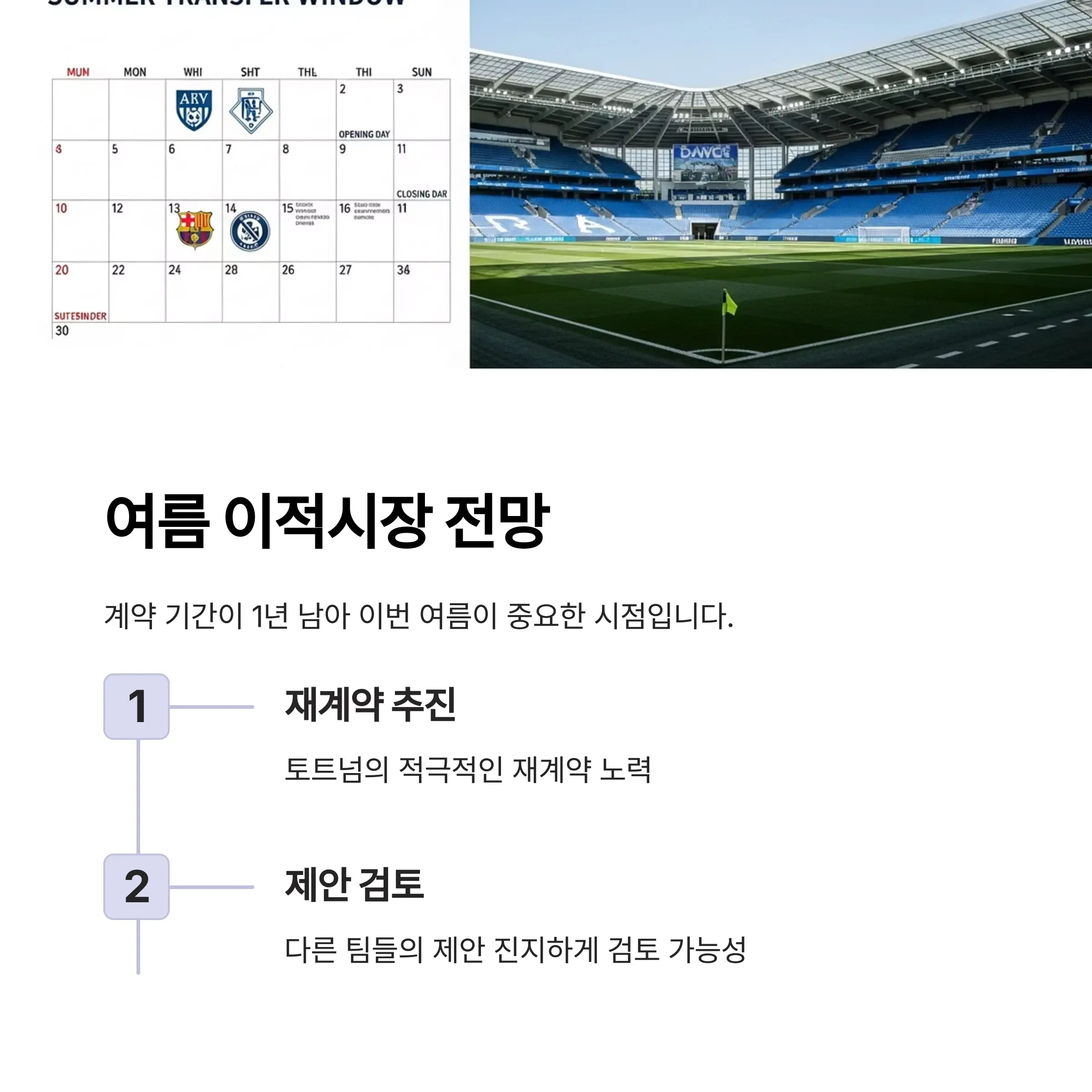 축구 이적시장은 보통 여름에 가장 활발하게 움직입니다. 유럽 축구 전문가들은 손흥민 선수의 계약 기간이 1년 남았기 때문에, 이번 여름 이적시장에서 토트넘이 재계약을 추진하거나, 아니면 다른 팀들의 제안을 진지하게 검토할 가능성이 높다고 보고 있습니다.