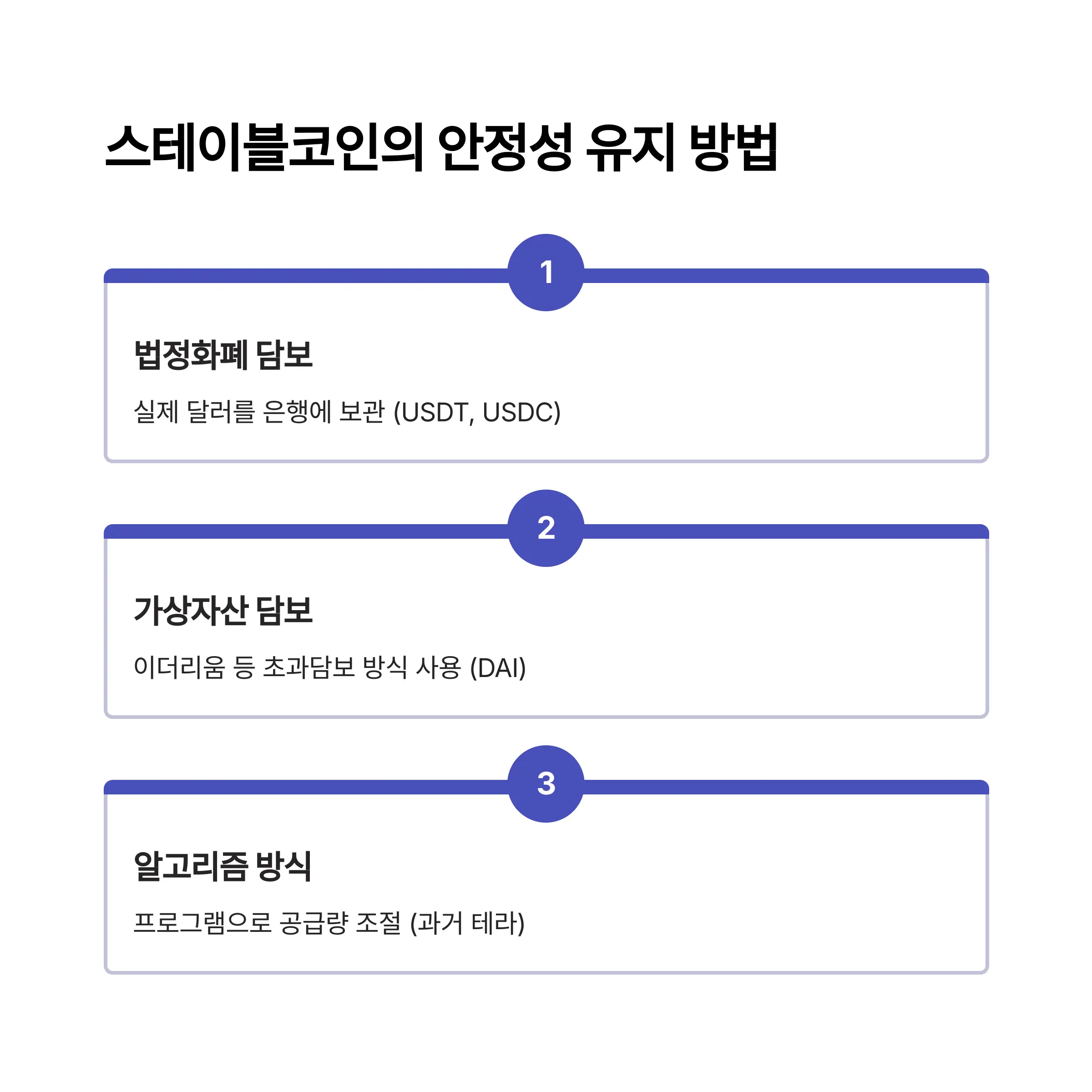 스테이블코인이 안정성을 유지하는 방법은 크게 세 가지입니다.