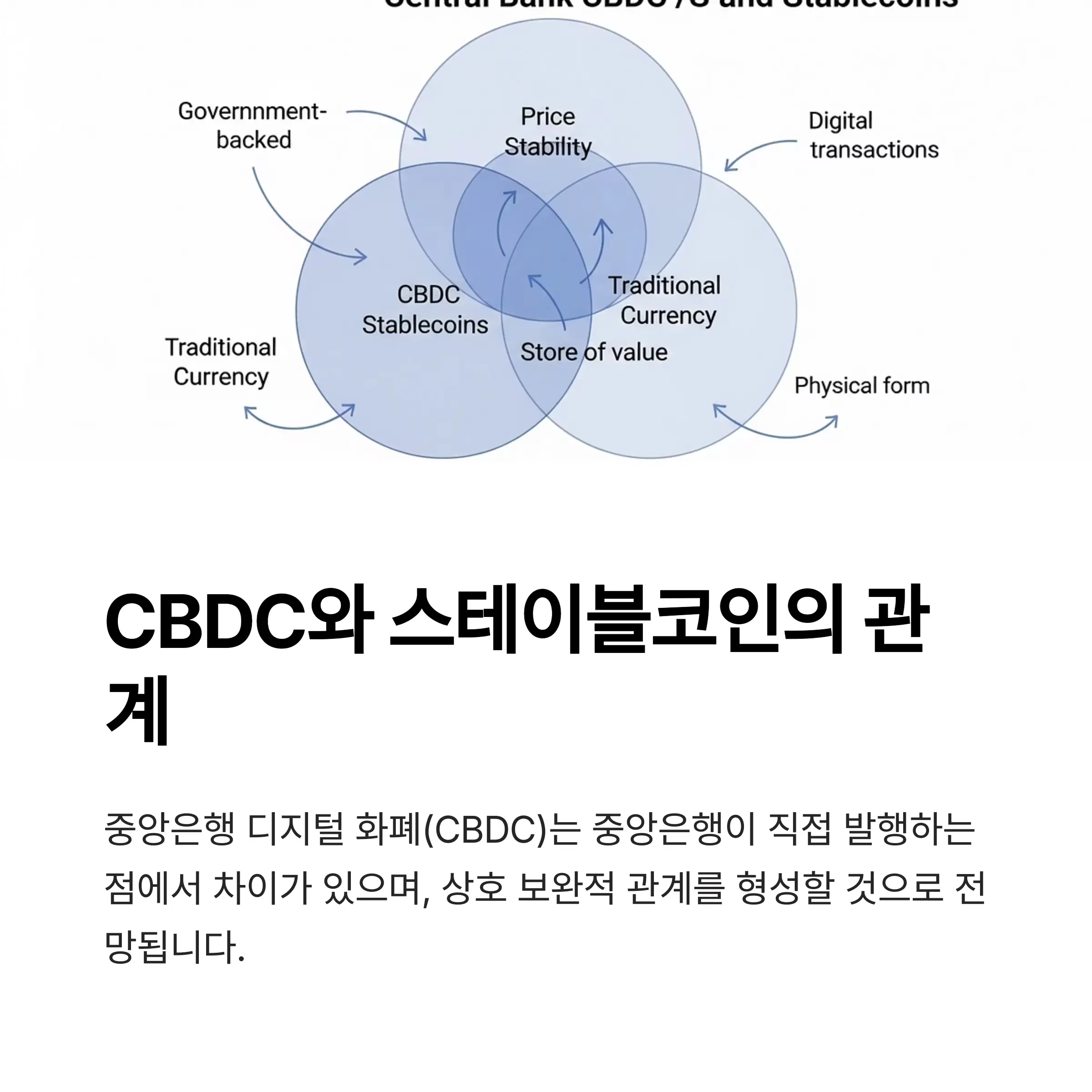중앙은행 디지털 화폐(CBDC)는 각국 중앙은행이 발행하는 디지털 화폐입니다. CBDC는 스테이블코인과 유사하게 안정적인 가치를 지니지만, 중앙은행이 직접 발행하고 관리한다는 점에서 차이가 있습니다. 일부에서는 CBDC가 스테이블코인을 대체할 것이라고 보기도 하고, 다른 한편으로는 서로 보완적인 관계를 형성할 것이라는 전망도 있습니다.