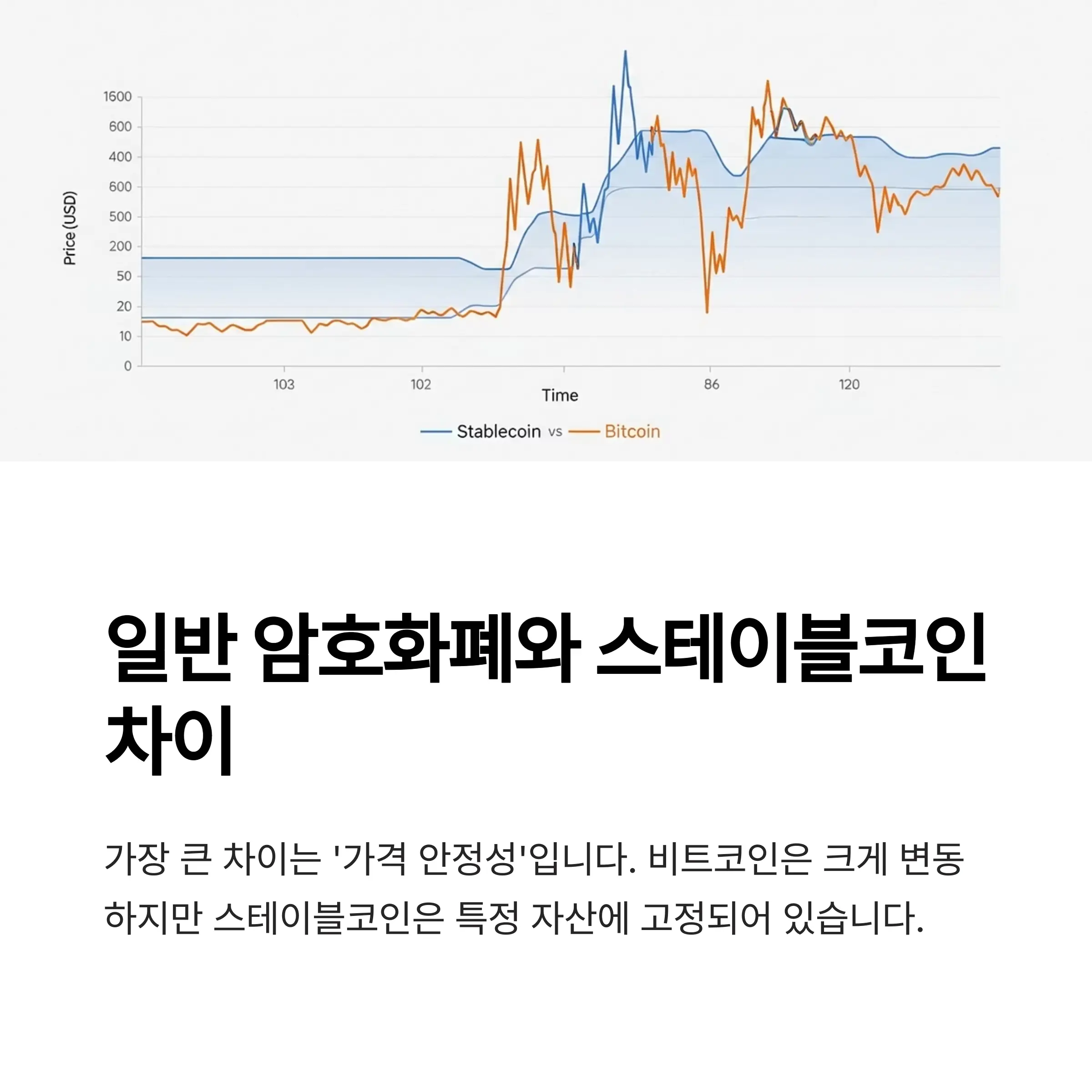 가장 큰 차이는 ‘가격 안정성’입니다. 비트코인 등 일반 암호화폐는 수요와 공급에 따라 가격이 크게 변동하지만 스테이블코인은 특정 자산에 고정되어 가격 변동이 거의 없습니다.