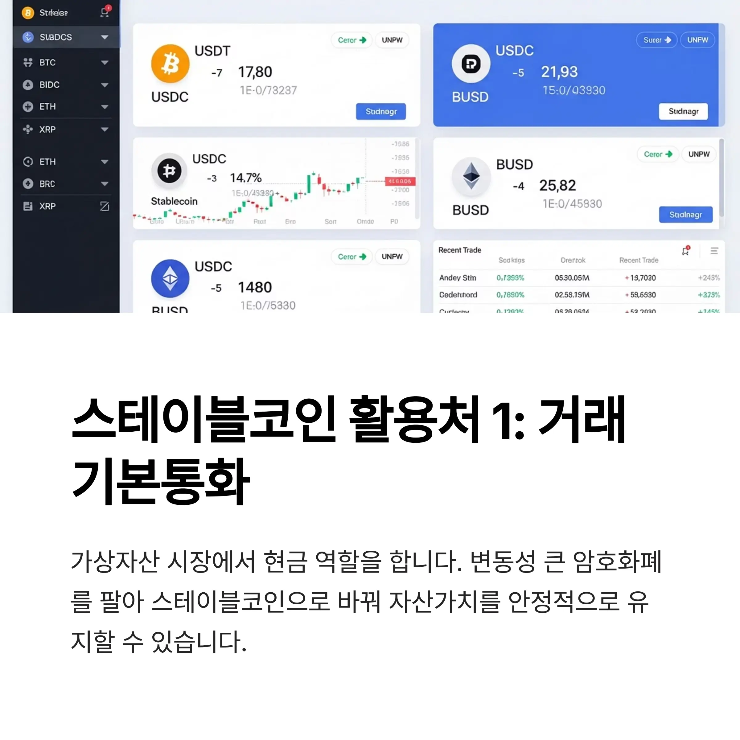 가산자산 시장은 가격 변동성이 매우 큽니다. 투자자들은 가격 변동이 심한 암호화폐를 팔아 현금화하는 대신 스테이블코인으로 바꿔두어 자산 가치를 안정적으로 유지할 수 있습니다. 이는 마치 주식 시장에서 현금처럼 사용되는 것과 같습니다.