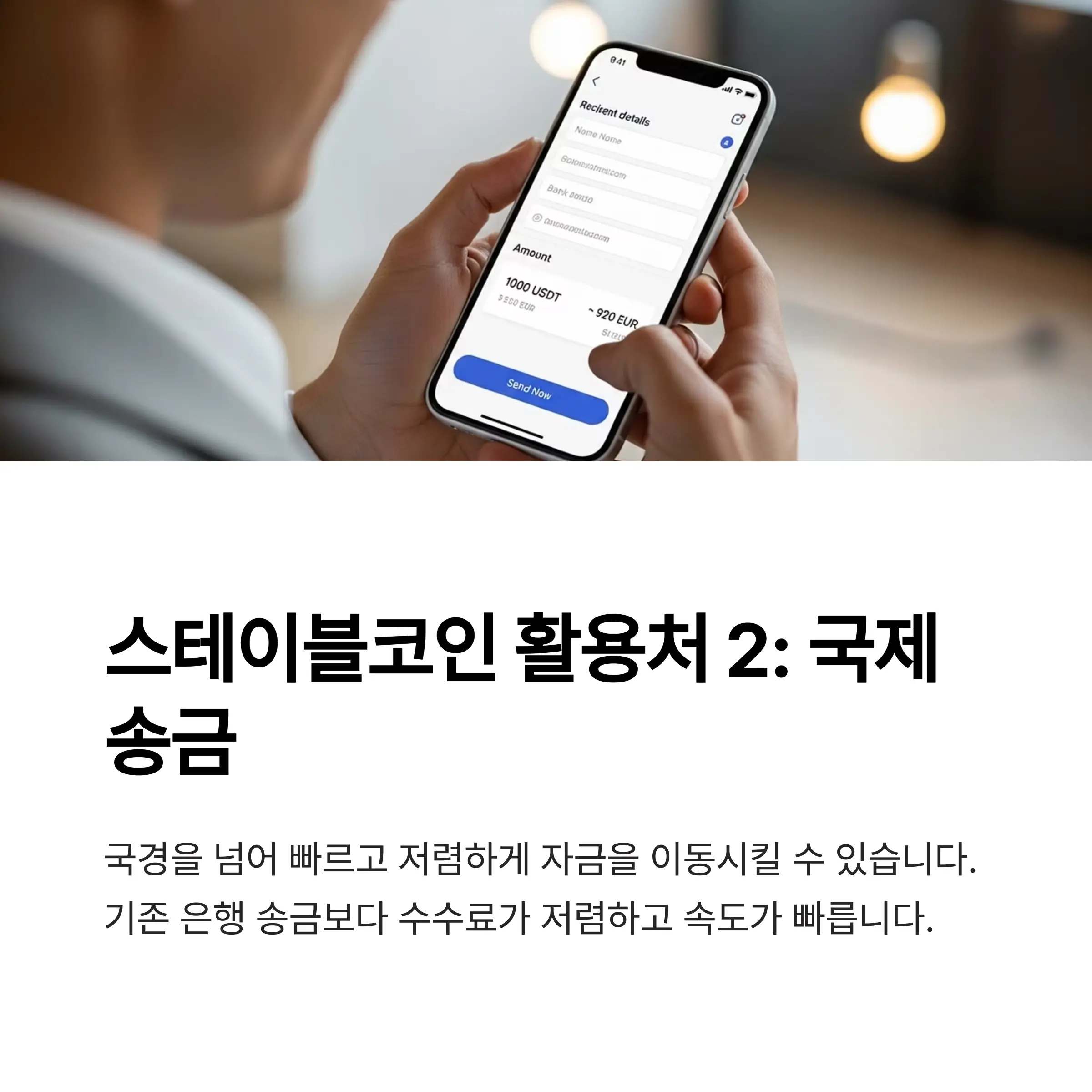 스테이블코인은 국경을 넘어 빠르고 저렴하게 자금을 이동시키는 데 활용됩니다. 기존 은행 송금보다 수수료가 저렴하고 전송 속도가 빠르다는 장점이 있어 국제 무역이나 해외 송금 시 유용하게 사용될 수 있습니다.