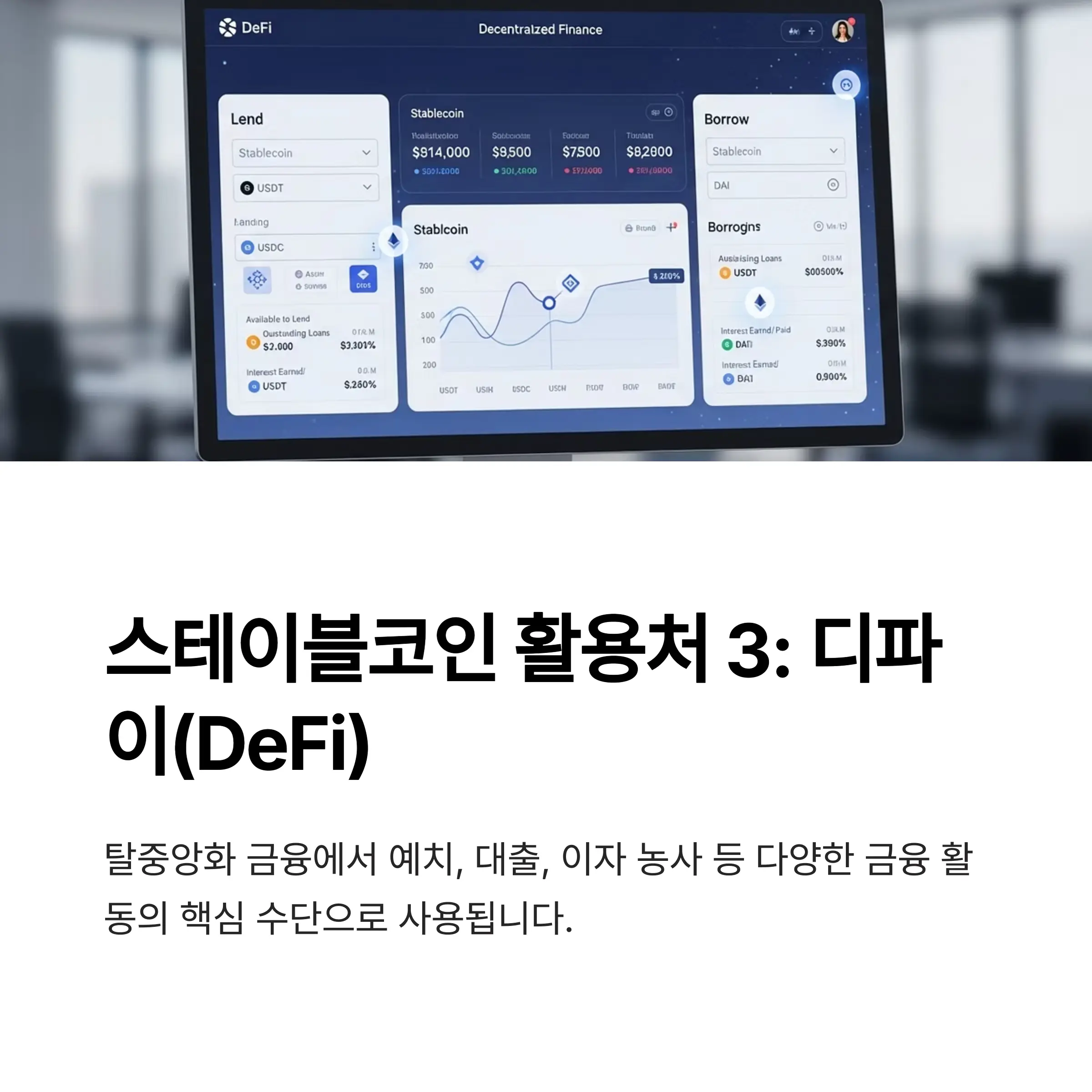 디파이(DeFi, 탈중앙화 금융)는 블록체인 기반의 금융 서비스입니다. 스테이블코인은 디파이 플랫폼에서 예치, 대출, 이자 농사 등 다양한 금융 활동의 핵심 수단으로 사용됩니다. 안정적인 가치를 지니므로 변동성 걱정 없이 이자 수익을 얻거나 담보로 활용할 수 있습니다.