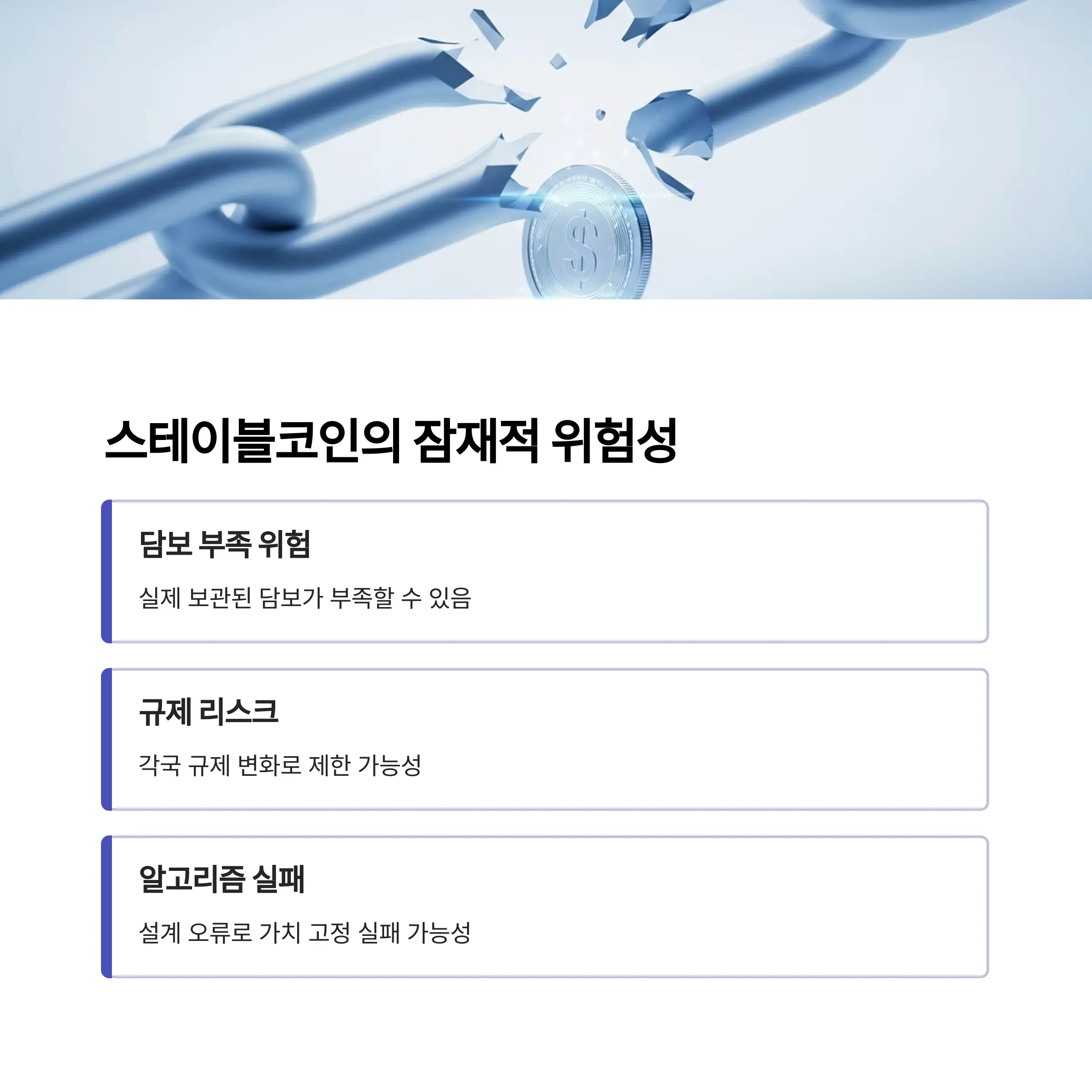 - 알고리즘 실패: 알고리즘 스테이블코인은 설계 오류나 시장의 급격한 변화로 인해 가치 고정이 실패할 수 있습니다.