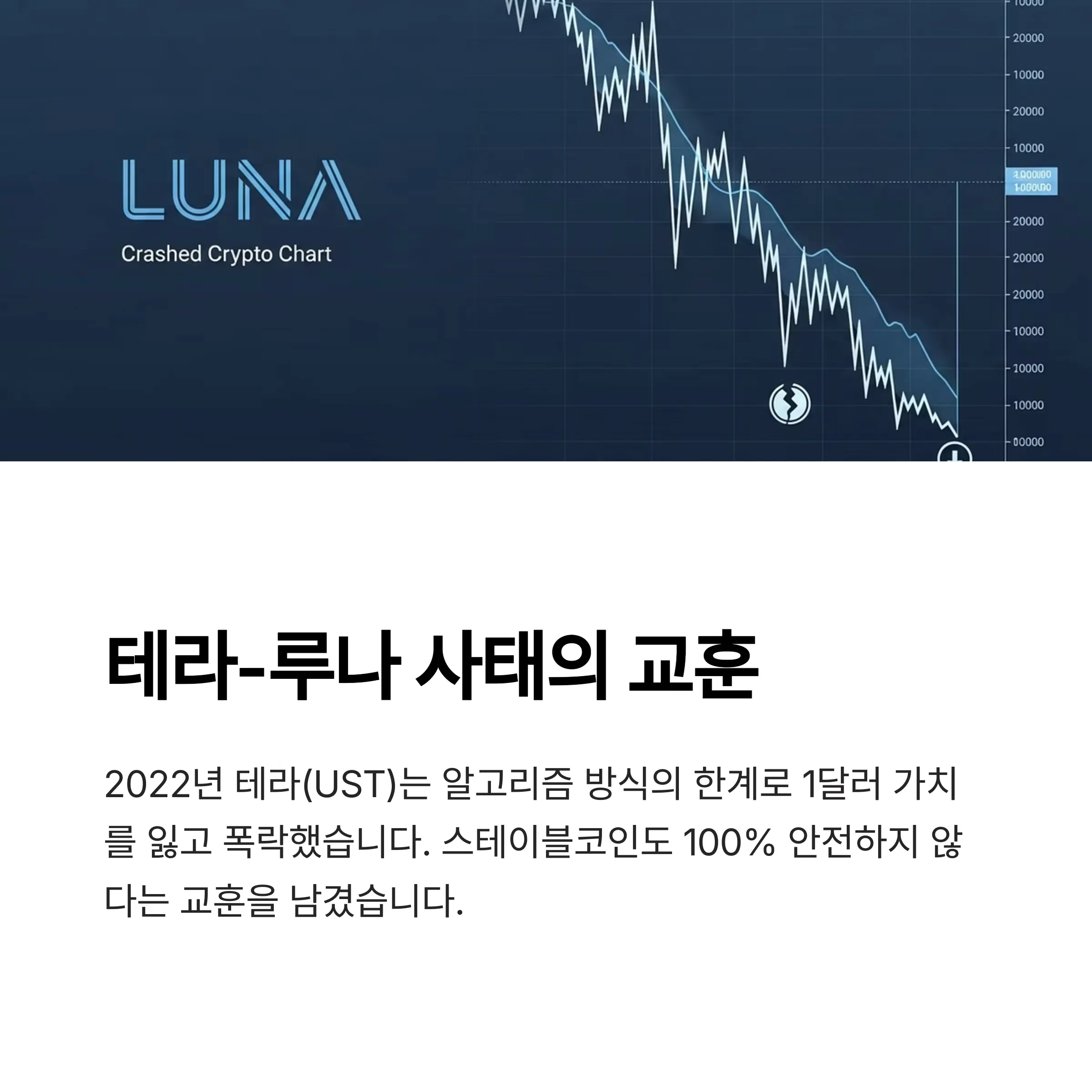 - 알고리즘 스테이블코인: 담보 없이 복잡한 컴퓨터 프로그램(알고리즘)을 통해 코인의 공급량을 조절하여 가치를 유지하려 합니다. 과거 테라(UST)가 이 방식이었으나, 알고리즘의 한계로 인해 대규모 가치 하락 사태를 겪으며 큰 교훈을 남겼습니다.