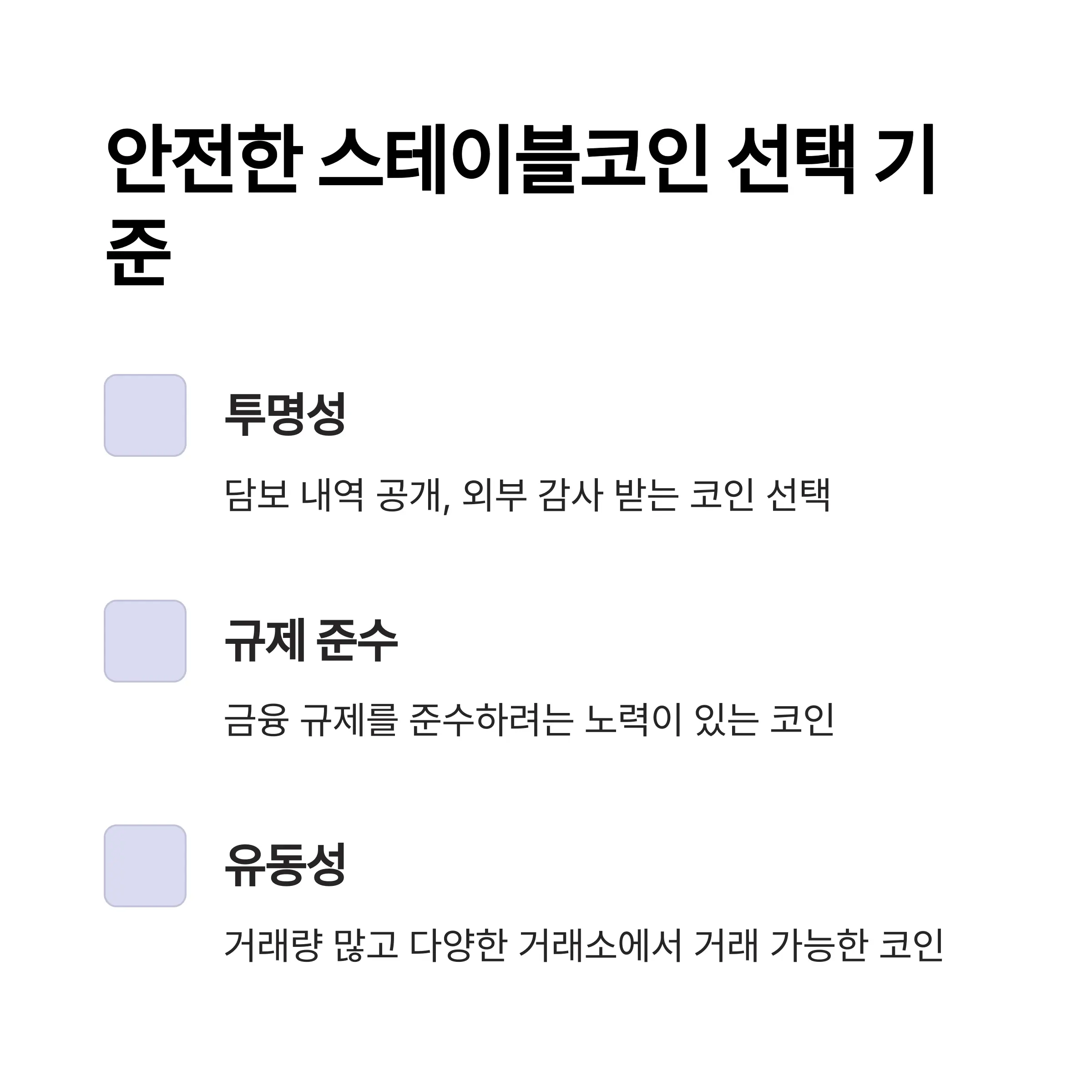 스테이블코인은 가격 변동성이 낮지만, 예금자 보호 대상이 아니며 원금 손실의 가능성이 있습니다. 따라서 투자 전에는 해당 코인의 담보 방식, 발행 주체, 투명성 등을 철저히 조사해야 합니다.