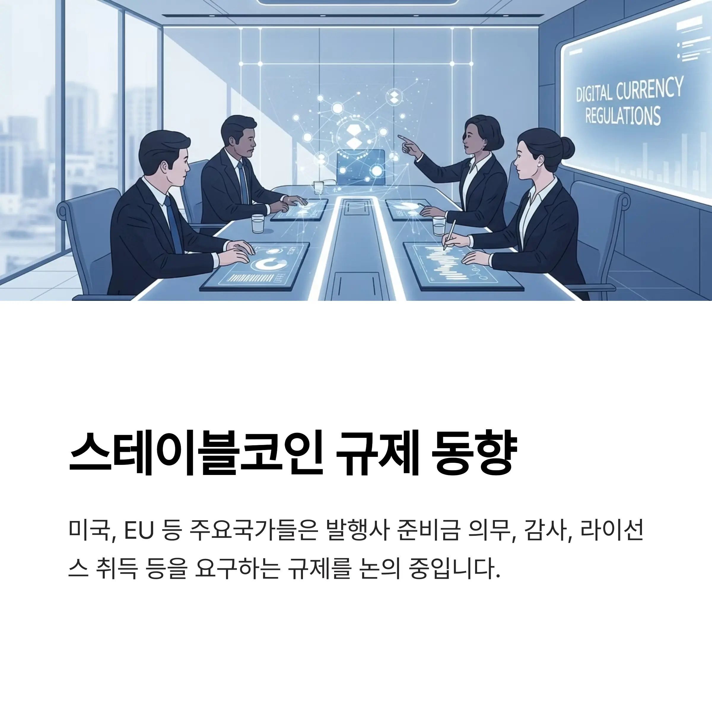 미국, 유럽연합(EU) 등 주요 국가들은 스테이블코인을 금융 시스템에 편입시키고 소비자 보호를 강화하기 위한 규제 법안을 논의 중입니다. 주로 발행사의 준비금 의무, 감사, 라이선스 취득 등을 요구하는 방향으로 진행되고 있습니다.
