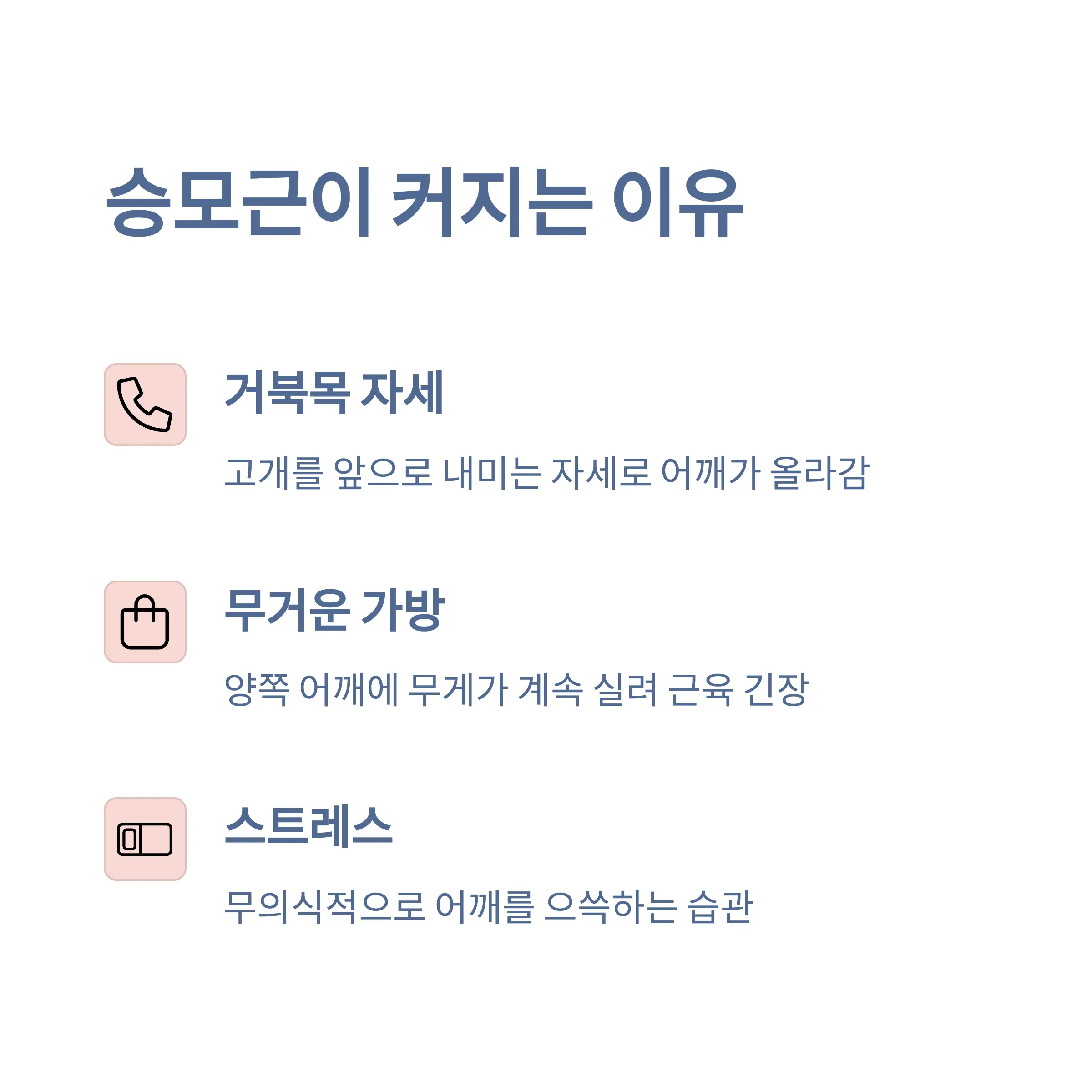- 잘못된 운동 자세: 등운동을 할 때 어깨를 위로 올리는 식의 동작은 승모근을 과도하게 자극해요.