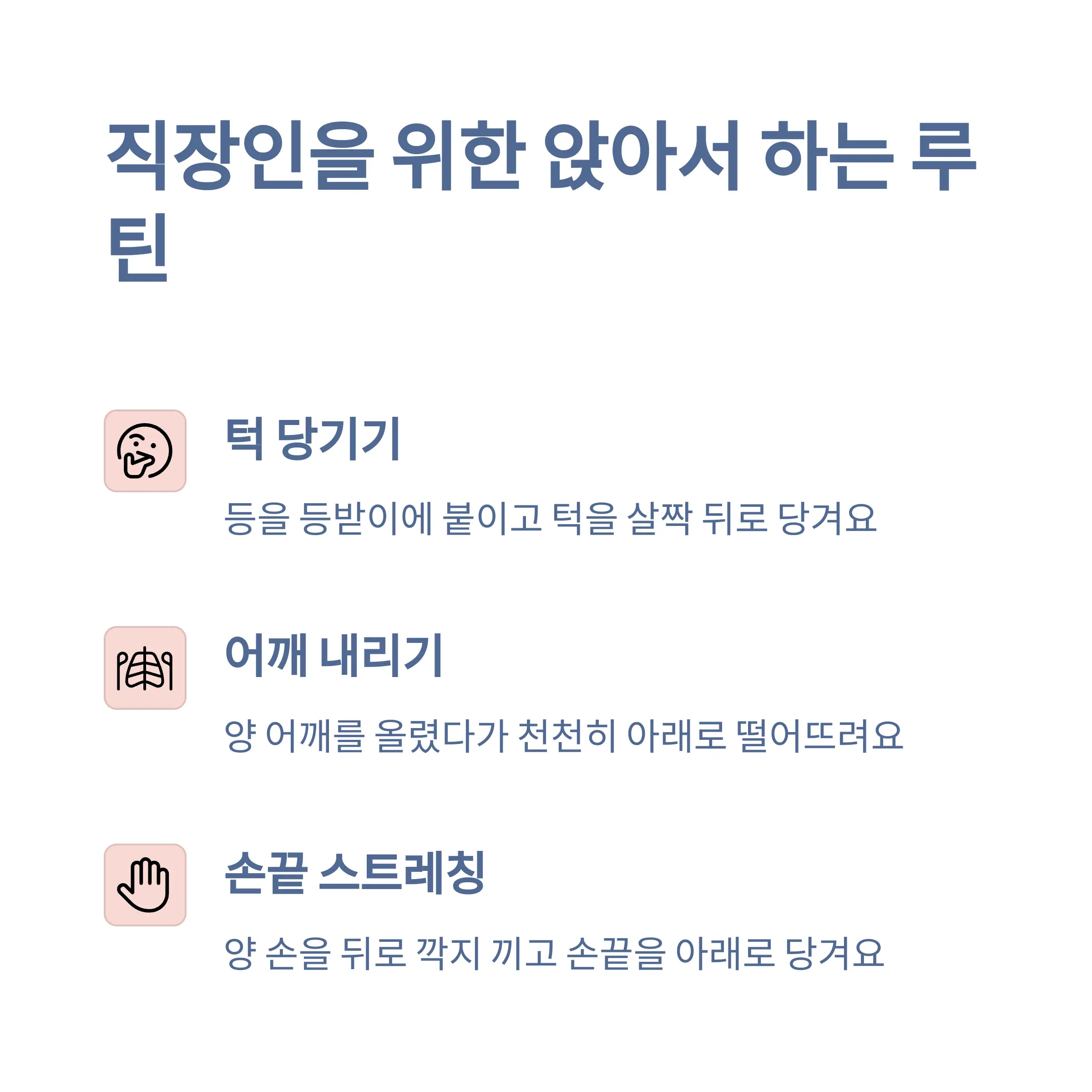 - 턱 당기기: 등을 등받이에 붙이고 턱을 살짝 뒤로 당겨요. 이 동작만으로도 목과 어깨의 정렬이 제대로 잡혀요.