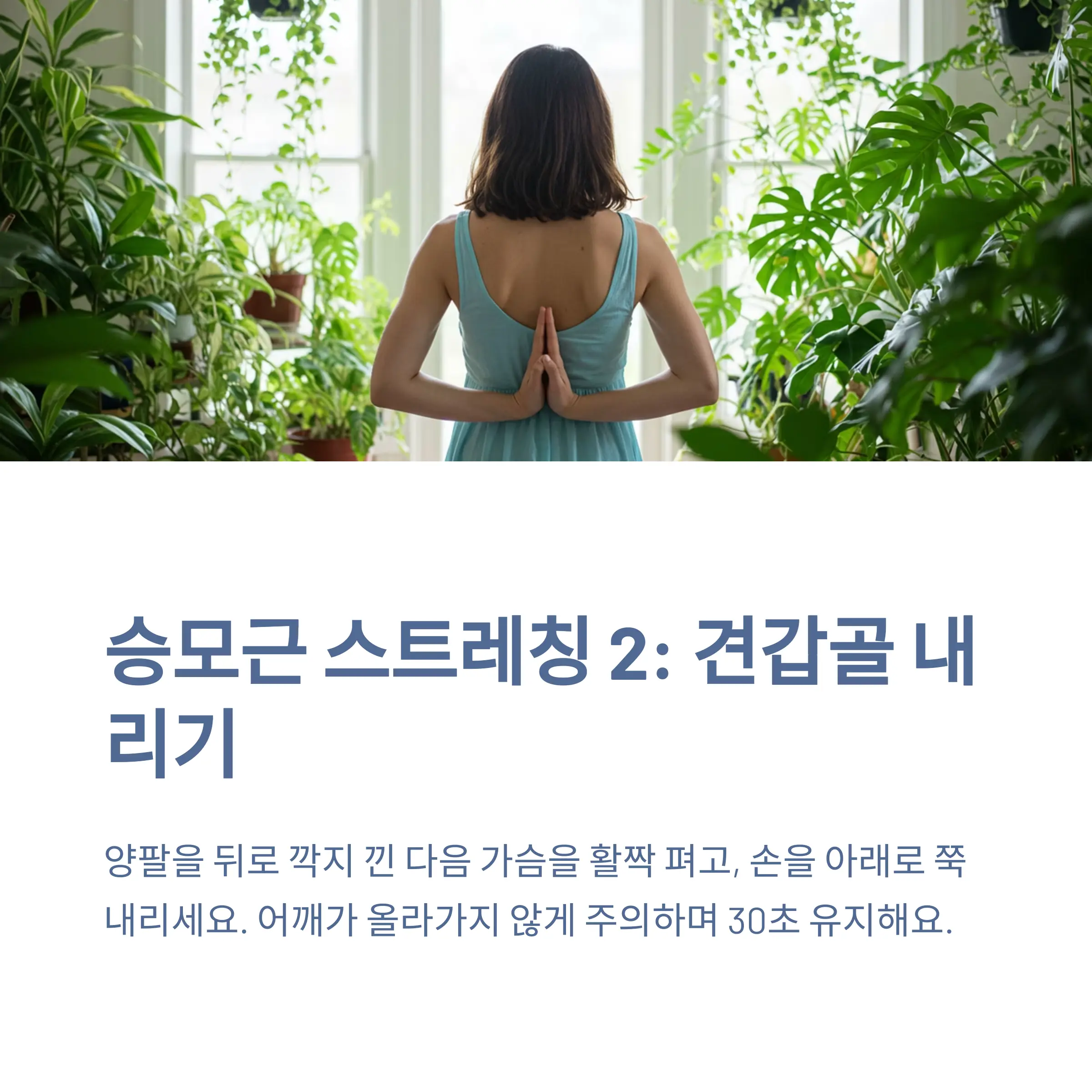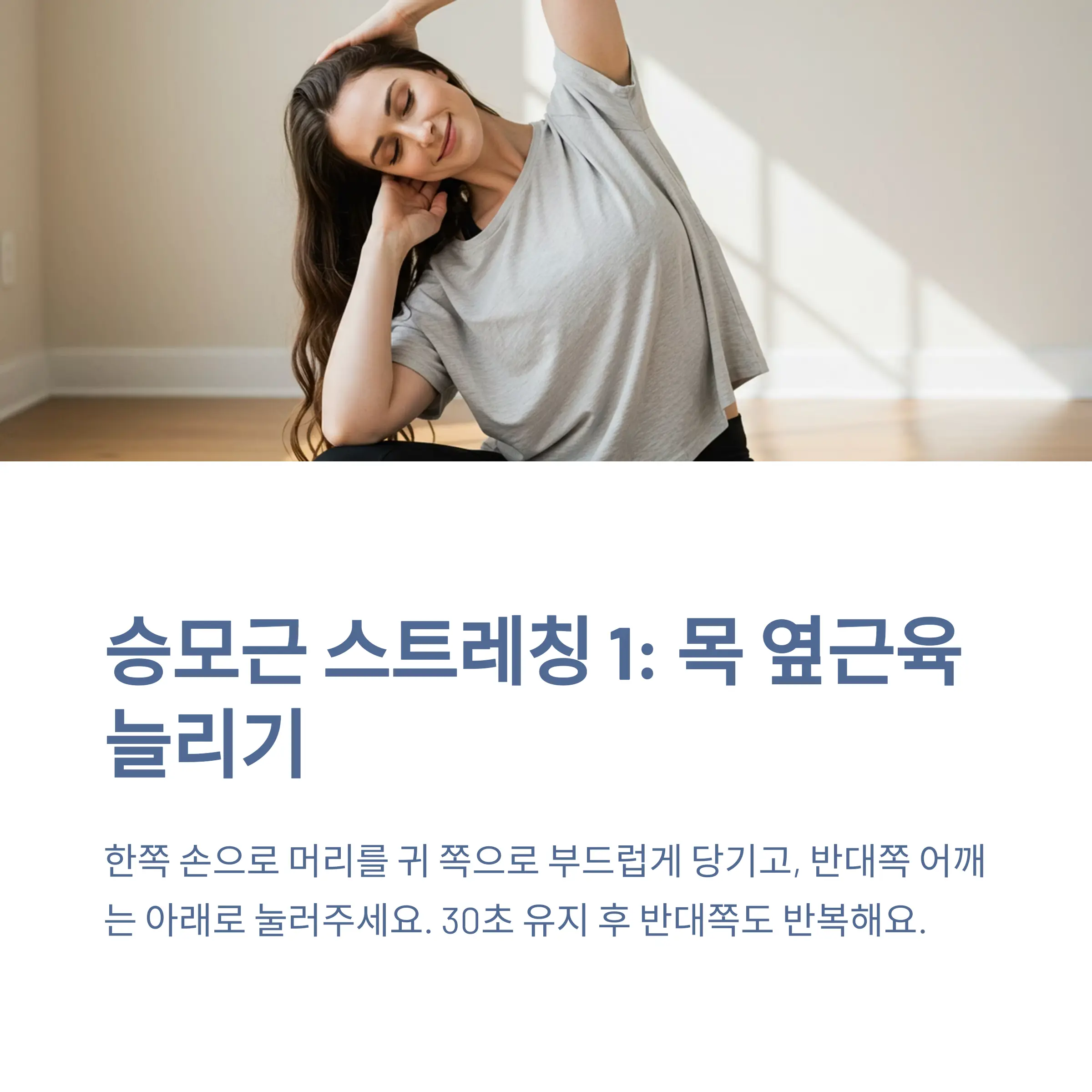 불필요하게 커진 승모근은 스트레칭으로 근육을 이완하고 길게 늘려주는 게 핵심이에요. 다음 세 가지 동작은 하루 5분만 투자해도 충분히 효과를 느낄 수 있어요.