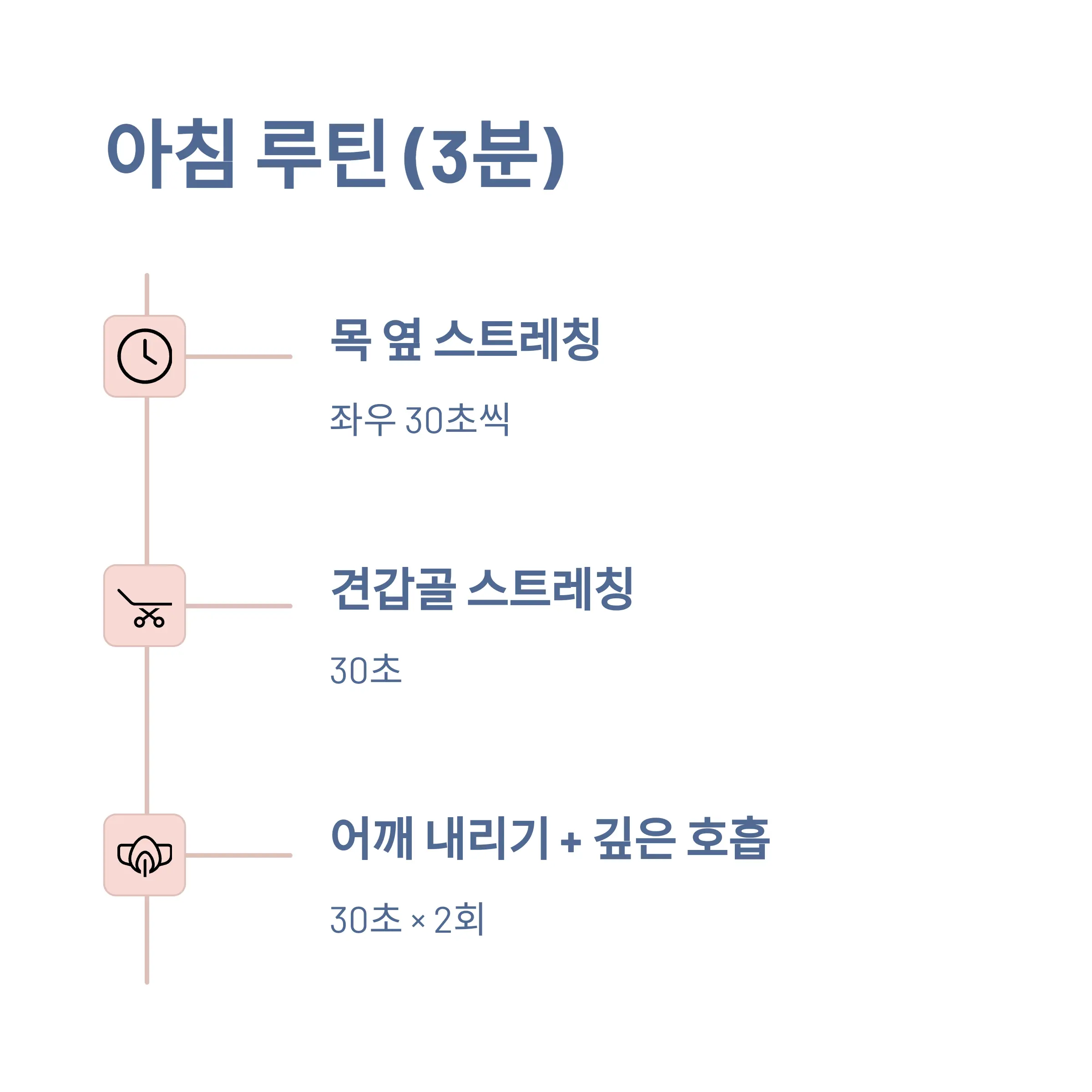 이 루틴은 약 3분이면 충분해요. 하루에 2~3번만 반복해도 승모근 뭉침 완화에 효과적이에요. 목 뒤 뻐근함이나 두통까지 줄어들고, 자세가 바르면 자연스럽게 호흡도 더 깊어져요.