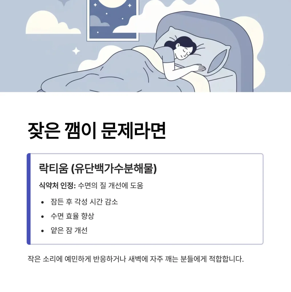 밤에 겨우 잠들어도 작은 소리에 예민하게 반응하거나 새벽에 눈이 떠져 다시 잠 못 이루는 분들에게는 락티움(유단백가수분해물)이 좋은 해답이 될 수 있습니다. 락티움은 식약처로부터 수면의 질 개선에 도움을 줄 수 있음을 인정받은 원료로 인체적용시험 결과 잠든 후 각성하는 시간을 줄이고 수면 효율을 높이는 것으로 확인되었습니다.