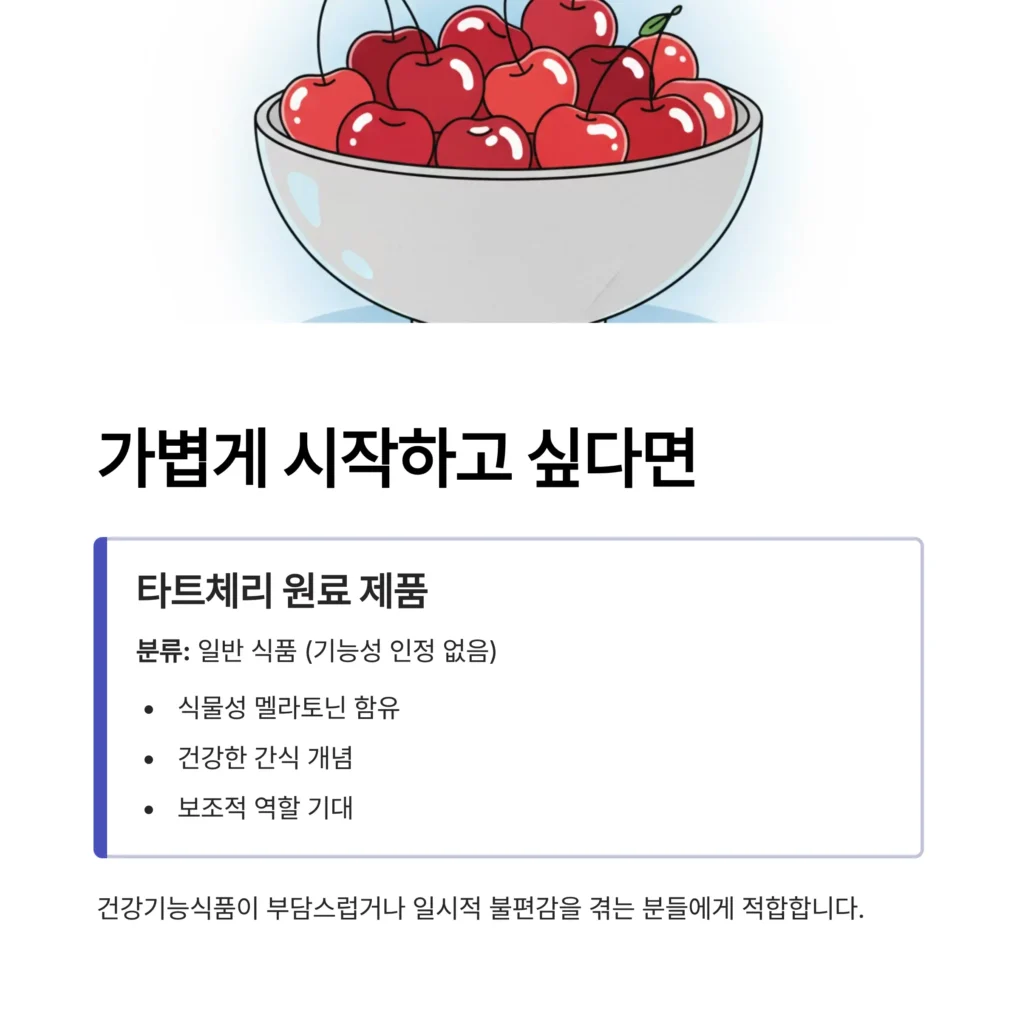 아직 건강기능식품이 부담스럽거나 일시적인 수면 불편감을 겪는 분들이라면 타트체리를 활용한 제품으로 시작해볼 수 있습니다. 타트체리는 식물성 멜라토닌을 비롯한 다양한 영양소가 풍부한 일반 식품입니다.