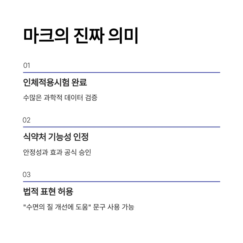 | 식약처 인정 | 수면의 질 개선에 도움 등 기능성 문구 허용 | 기능성 표현 불가 |