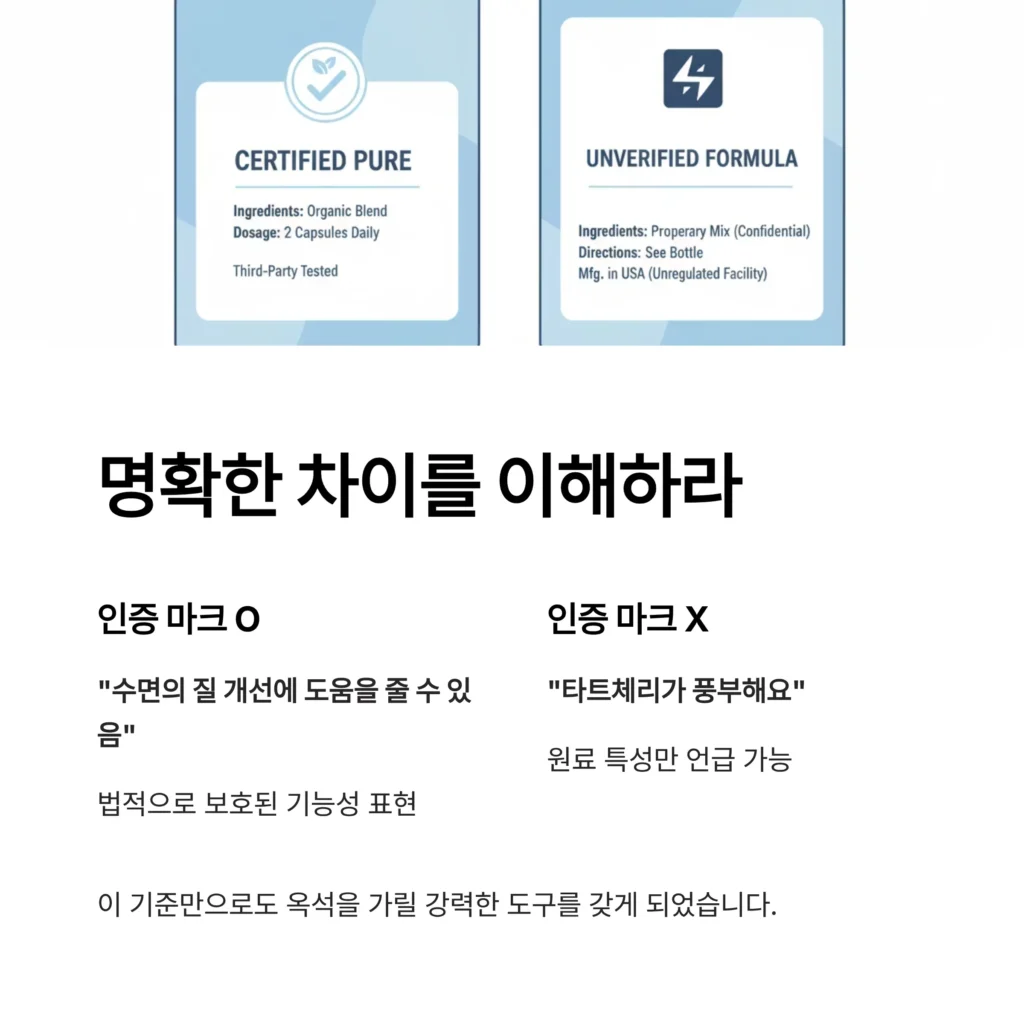 수면 영양제를 고를 때 수많은 정보 속에서 길을 잃지 않게 해주는 단 하나의 표지판이 있습니다. 바로 제품 포장의 건강기능식품 인증 마크입니다.