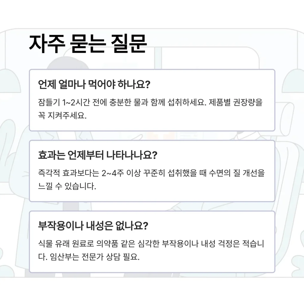A: 일반적으로 잠들기 1~2시간 전에 충분한 물과 함께 섭취하는 것을 권장합니다. 제품별 권장 섭취량을 꼭 지켜주세요.