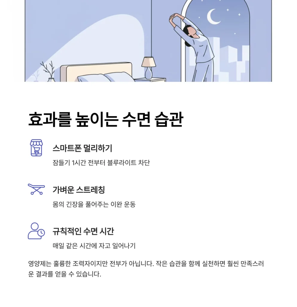 물론 영양제는 건강한 수면을 위한 훌륭한 조력자이지만 전부는 아닙니다. 잠들기 한 시간 전부터 스마트폰 멀리하기 가벼운 스트레칭으로 몸이완하기 같은 작은 습관을 함께 실천한다면 훨씬 더 만족스러운 결과를 얻을 수 있을 겁니다.