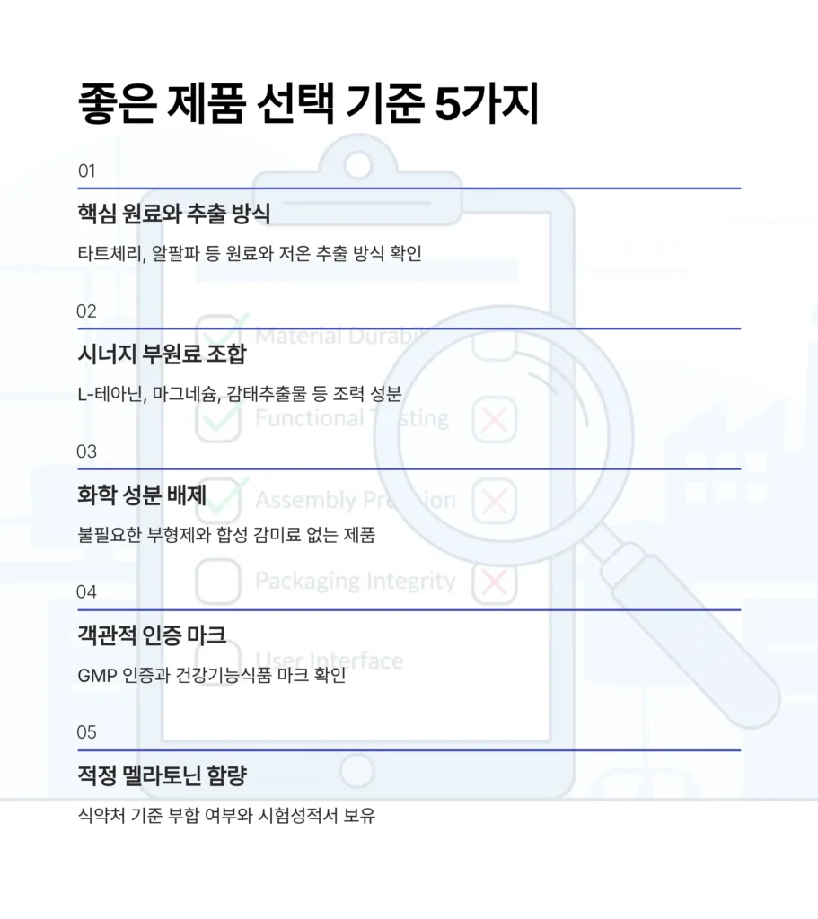 식물성 멜라토닌은 주로 타트체리, 자주개자리(알팔파) 등에서 추출합니다. 어떤 원료를 사용했는지 그리고 영양소 파괴를 최소화하는 저온 추출 등의 방식을 사용했는지 확인하는 것이 기본입니다. 원산지까지 투명하게 공개하는 제품이라면 더욱 신뢰할 수 있습니다.