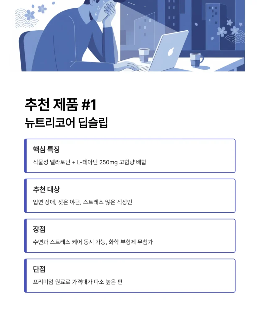 이제 좋은 제품을 구별할 수 있는 안목을 갖추셨습니다. 하지만 이 모든 기준을 충족하는 제품을 일일이 찾고 성분 배합의 미세한 차이까지 비교하는 것은 여전히 번거롭고 어려운 일일 수 있습니다. 그래서 저희가 수면 유형에 맞춰 이 까다로운 기준들을 모두 통과한 제품들을 미리 분석하고 정리해 보았습니다.