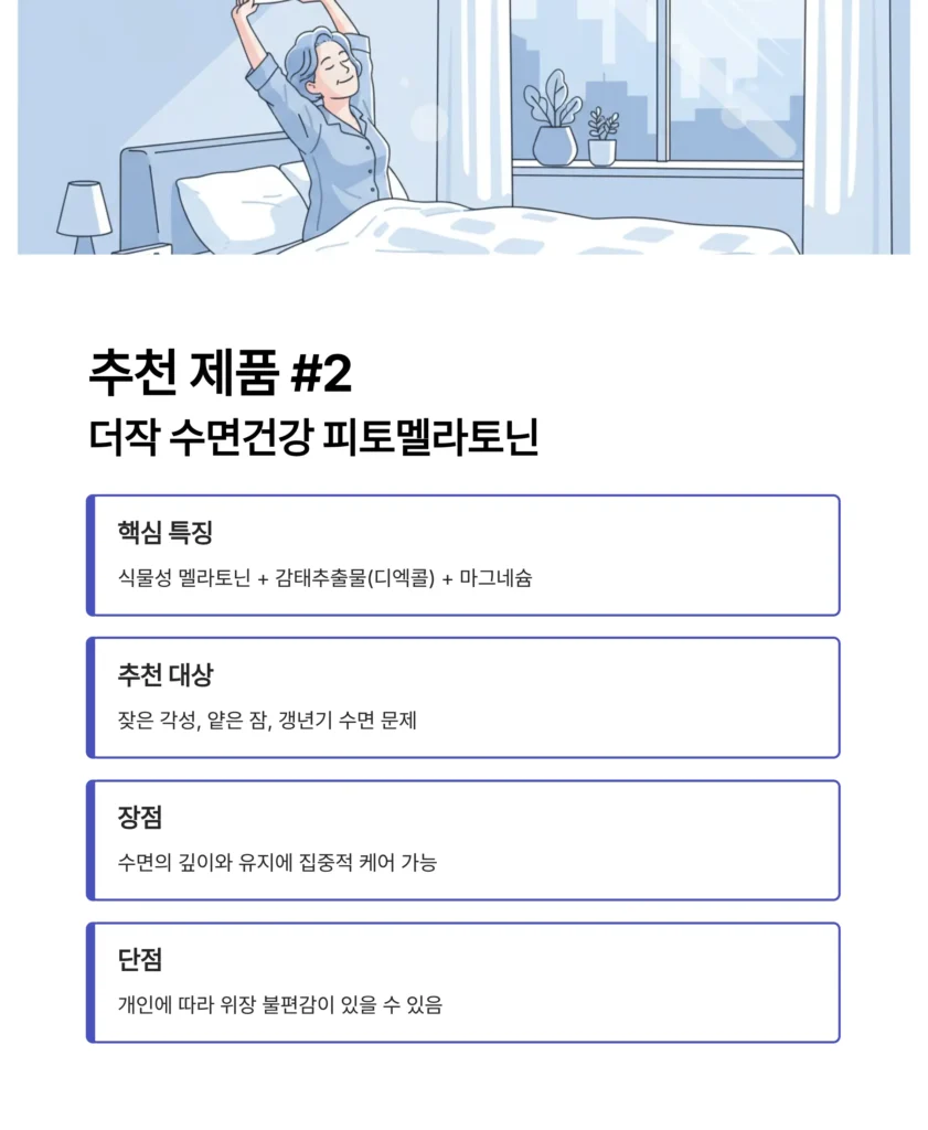 - 단점: 복합적인 수면 문제(스트레스, 잦은 각성 등)에 대한 즉각적인 효과는 다소 약할 수 있음