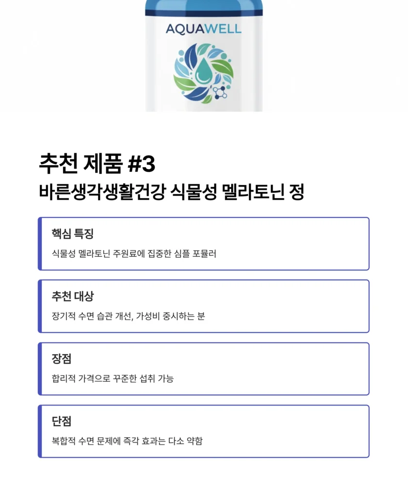 | 추천 대상 | 30대 직장인, 수험생 | 50대 이상, 만성 불면 | 꾸준한 관리가 필요한 분 |