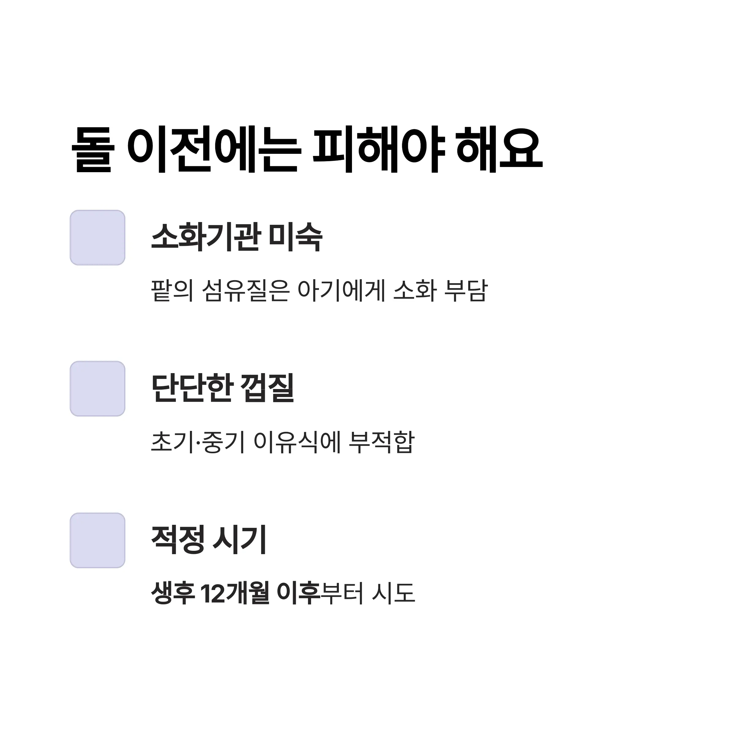 팥은 섬유질이 풍부해 장 건강에 좋다고 알려져 있지만, 반대로 보면 소화가 쉽지 않다는 뜻이기도 합니다. 성인에겐 좋은 성분도, 아직 소화기관이 미숙한 아기에게는 부담이 될 수 있습니다.