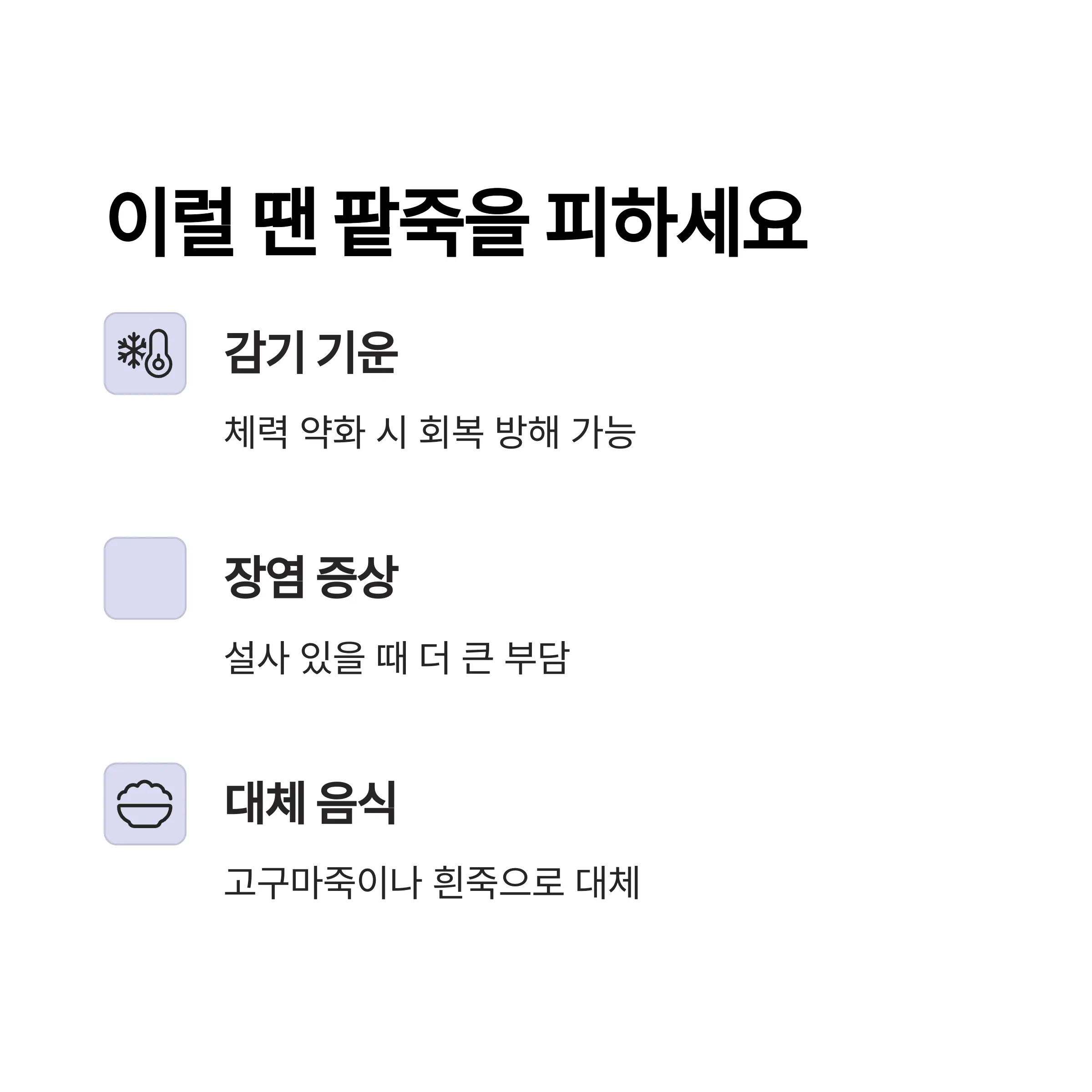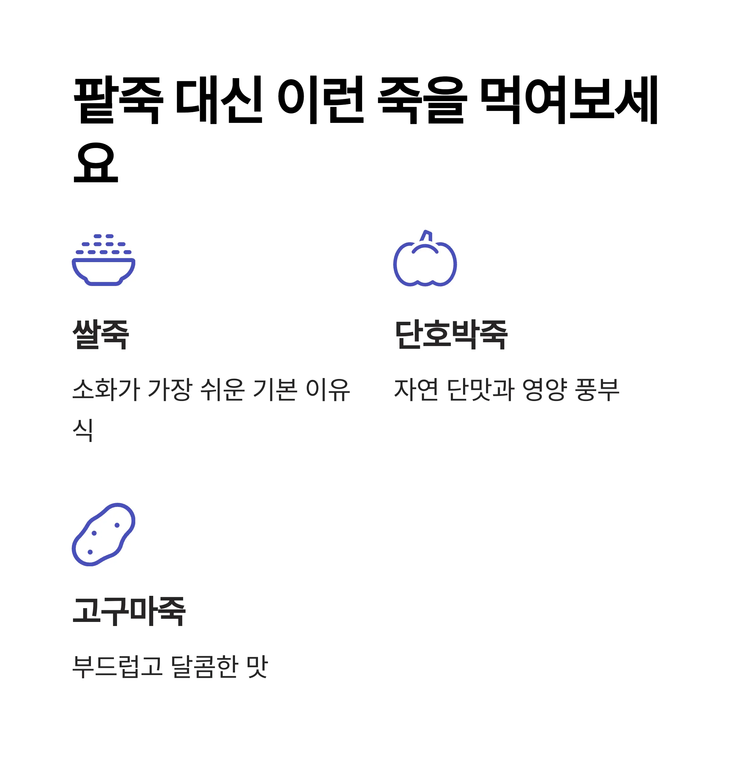 특히 설사 증상이 있는 경우 팥죽은 더 큰 부담을 줄 수 있으므로, 이런 시기에는 고구마죽이나 흰죽 등으로 대체해 주는 것이 현명한 선택입니다.