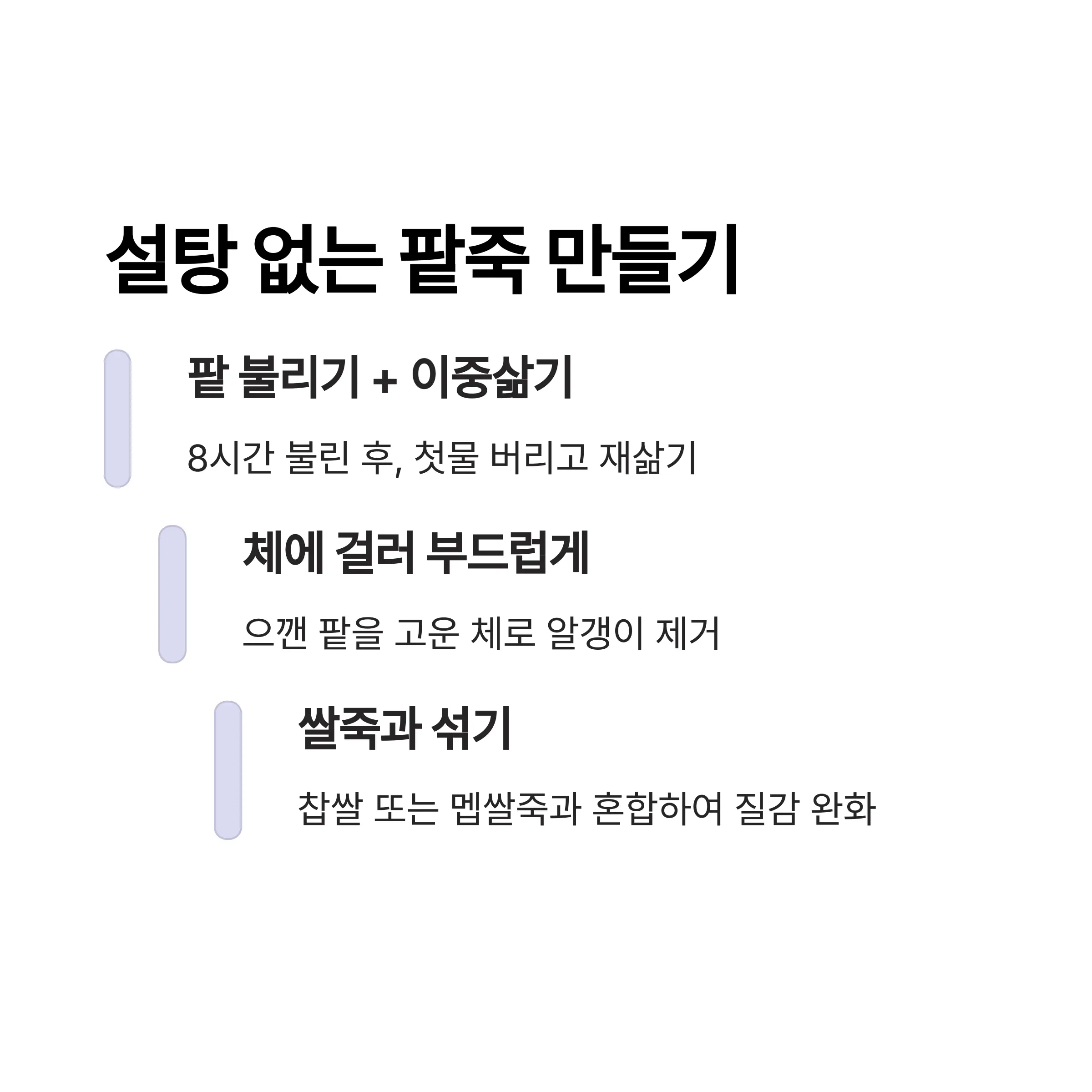 - 팥은 8시간 이상 불린 뒤, 끓는 물에 삶아 첫물을 버리고 한 번 더 삶습니다. 이는 쓴맛과 소화에 방해가 되는 성분을 제거하는 과정입니다.