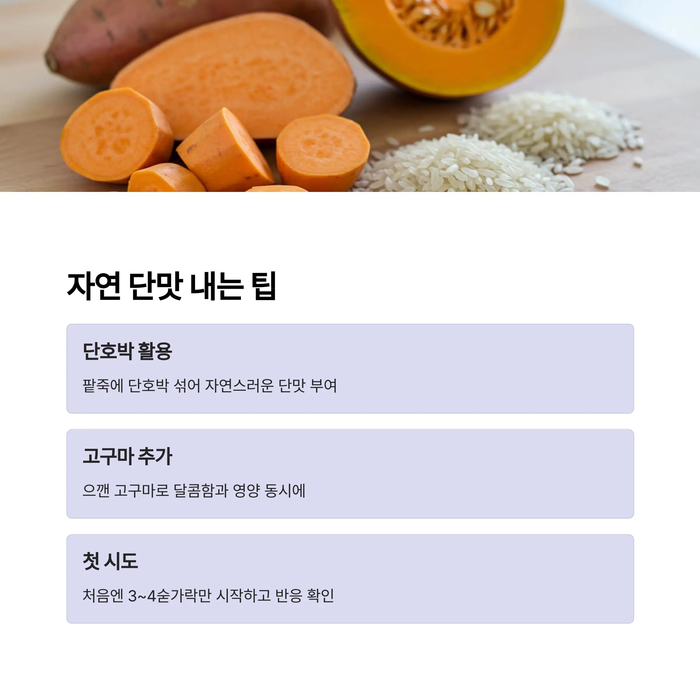 - 고운 쌀죽(찹쌀 또는 멥쌀)과 혼합하면 팥죽 특유의 질감을 완화시킬 수 있습니다. 설탕 대신 단호박이나 고구마를 함께 넣으면 자연스러운 단맛을 줄 수 있어요.