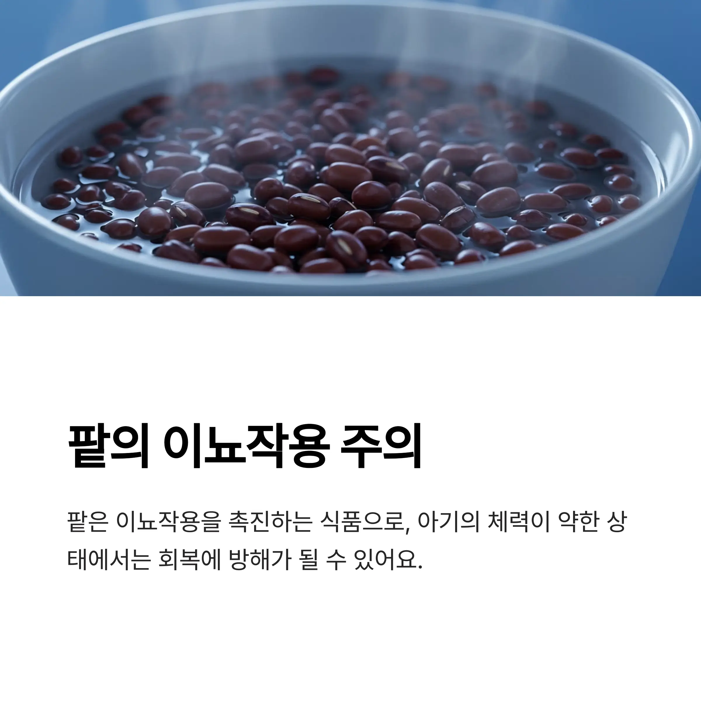 팥은 성질상 이뇨작용을 촉진하는 식품으로 알려져 있습니다. 때문에 감기나 장염 등으로 이미 체력이 약해진 상태의 아기에게는 회복에 방해가 될 수 있습니다.