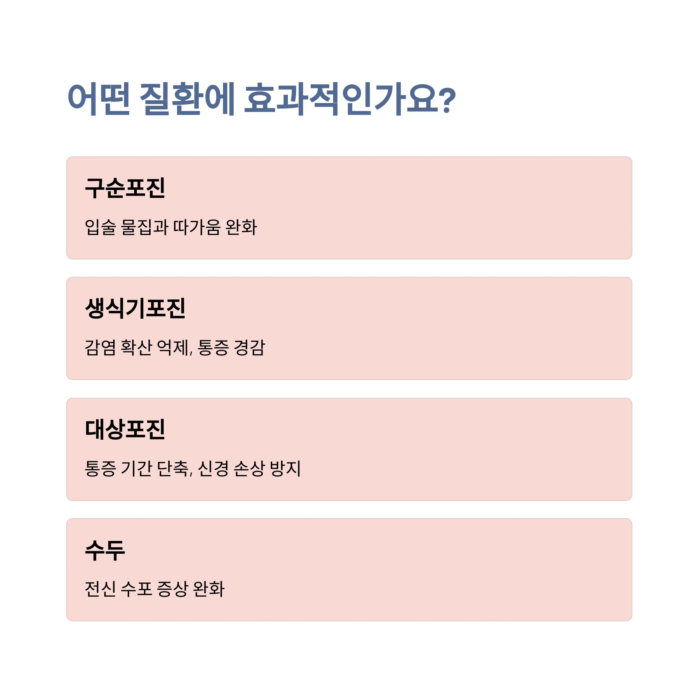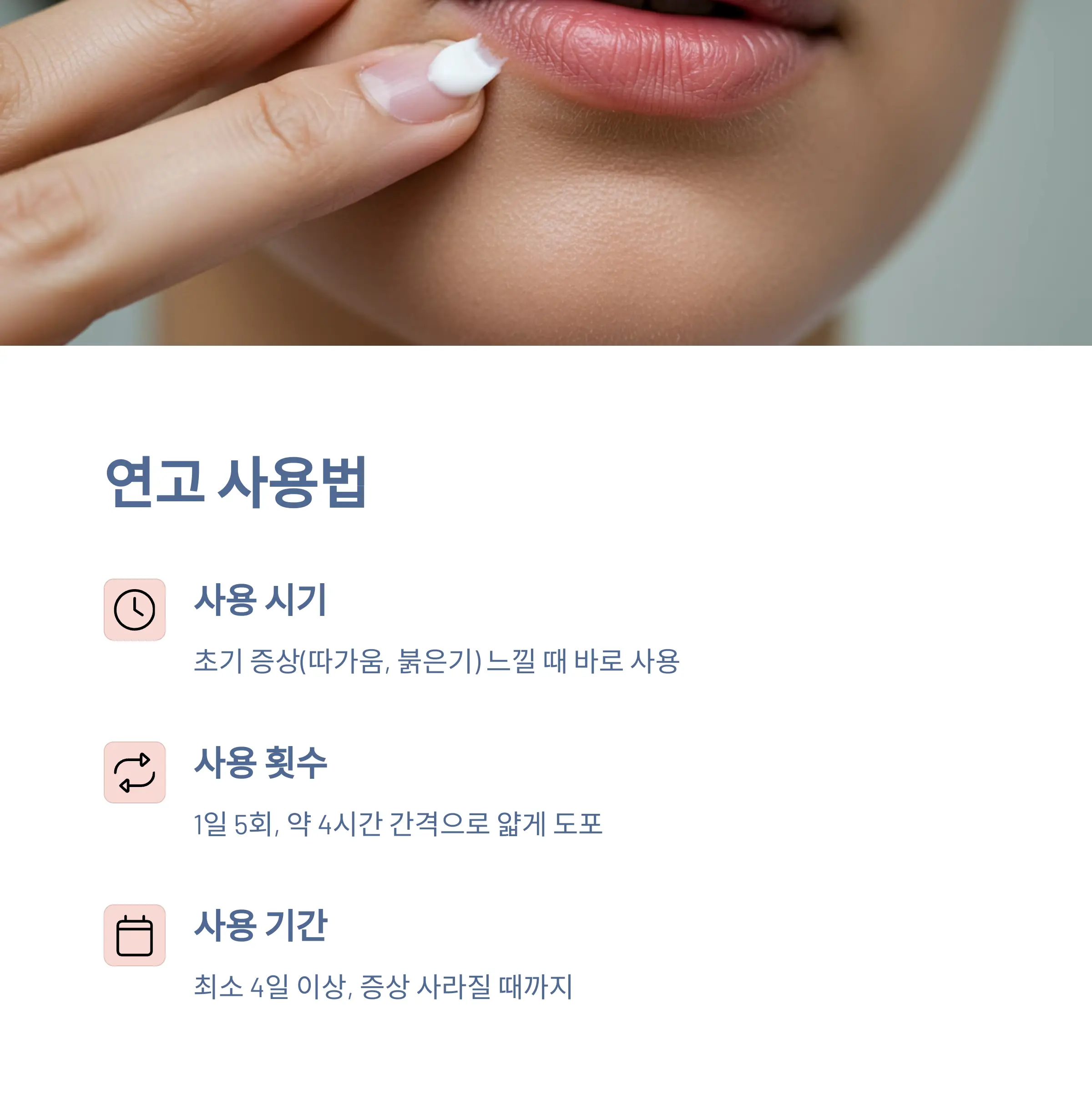- 구순포진: 입술 주변 물집과 따가움 완화, 빠른 회복 유도