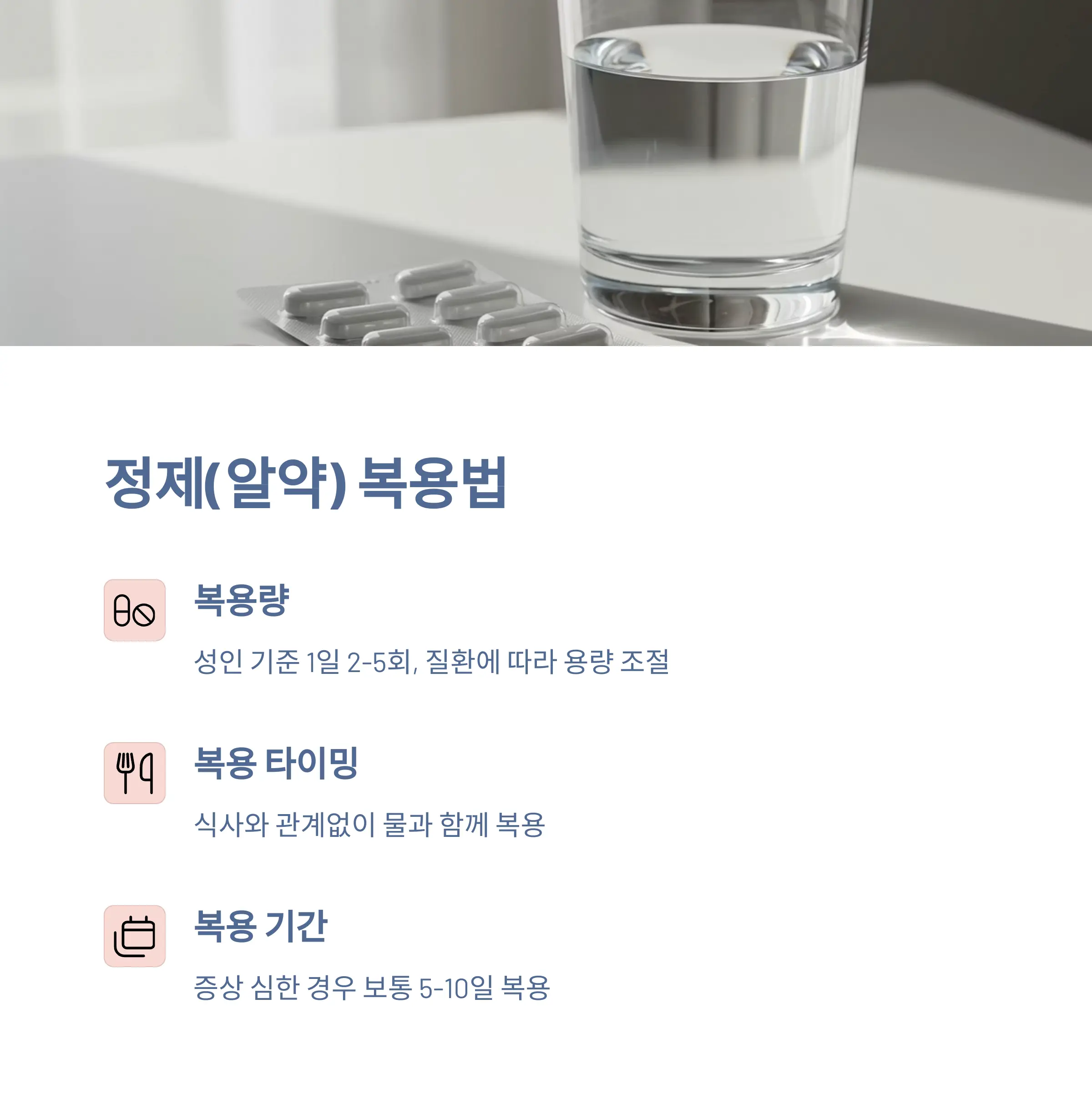 - 복용량: 성인 기준 1일 2~5회, 질환에 따라 용량 조절