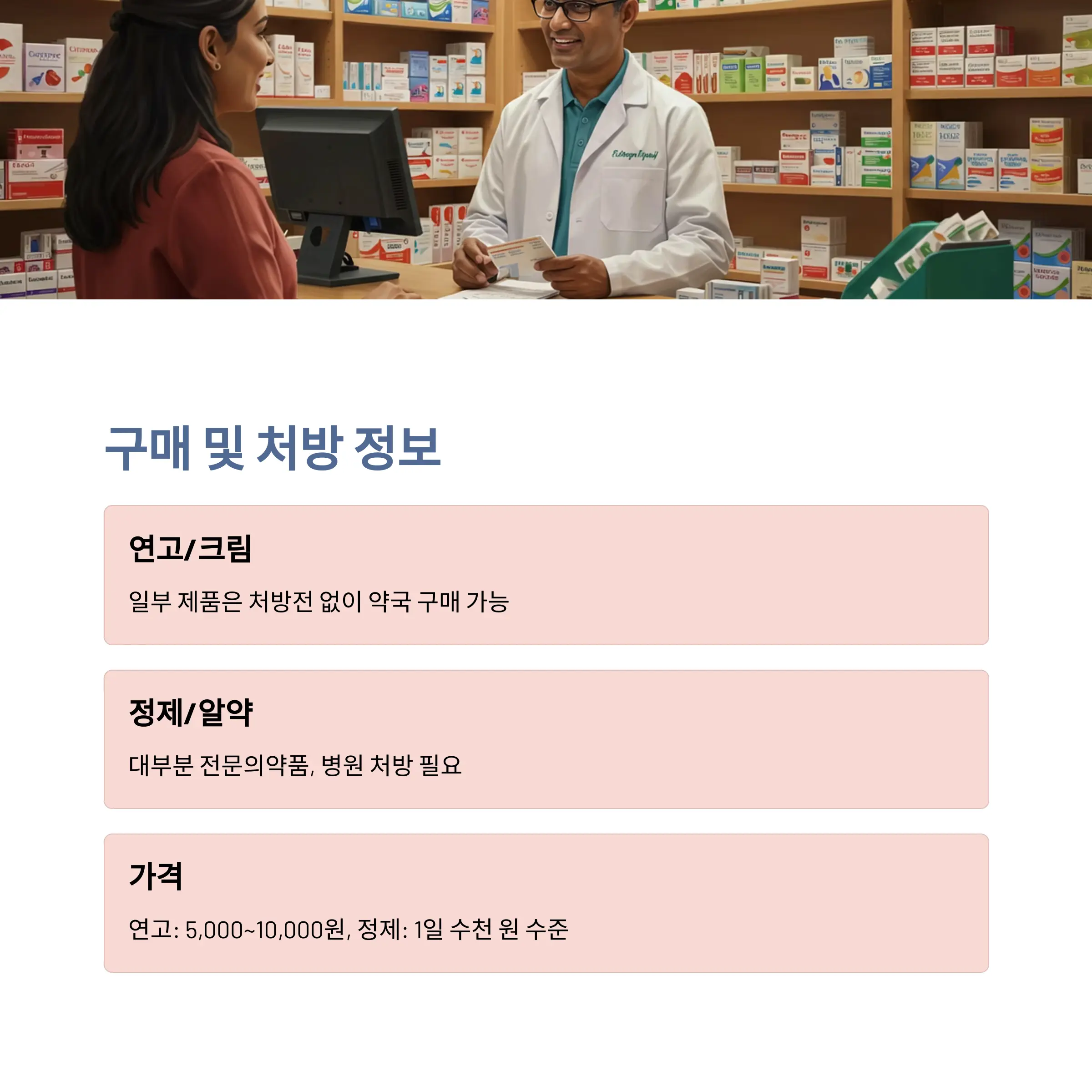 - 연고/크림: 일부 제품은 약국에서 처방전 없이 구입 가능 (일반의약품)