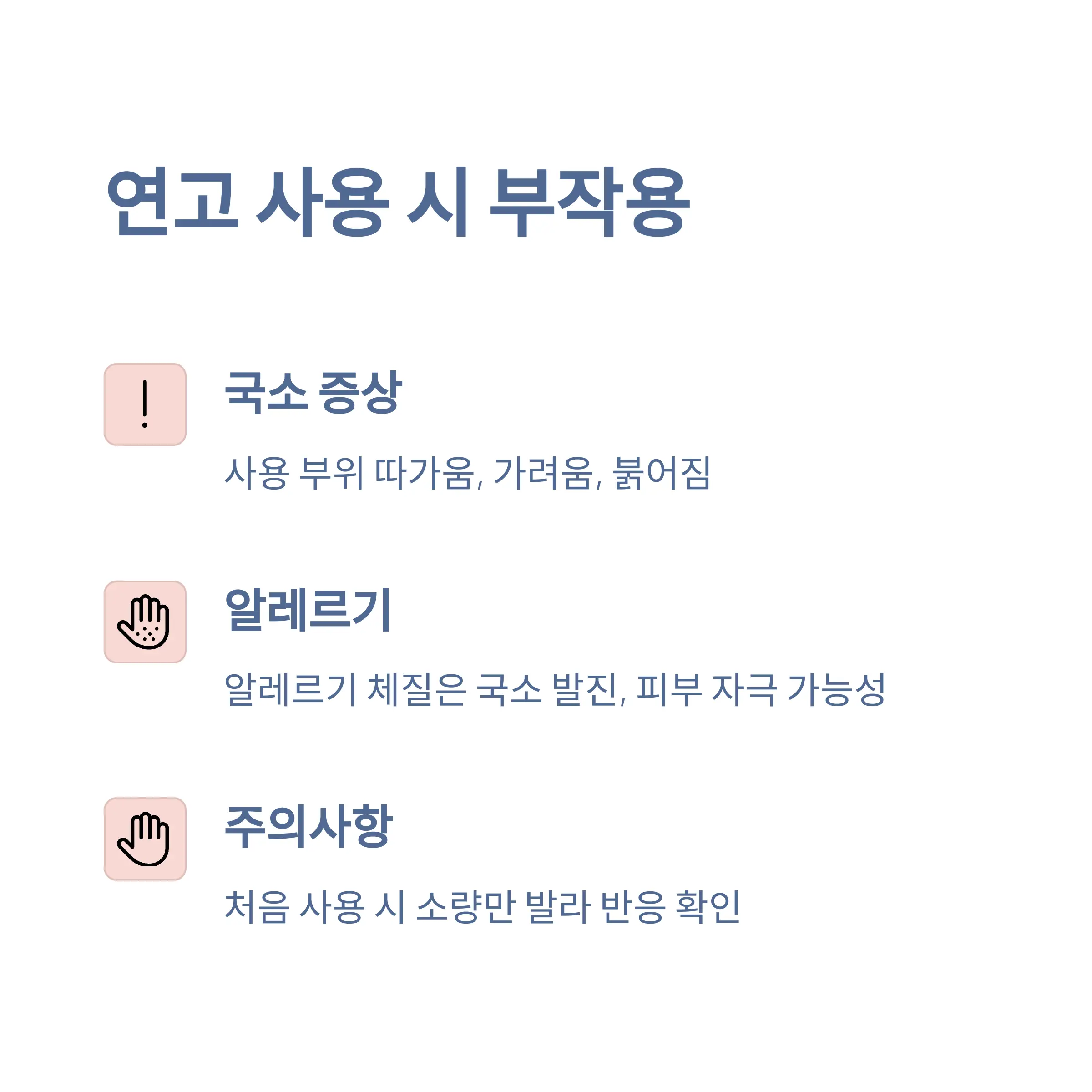 - 사용 부위의 따가움, 가려움, 붉어짐 등 가벼운 국소 증상