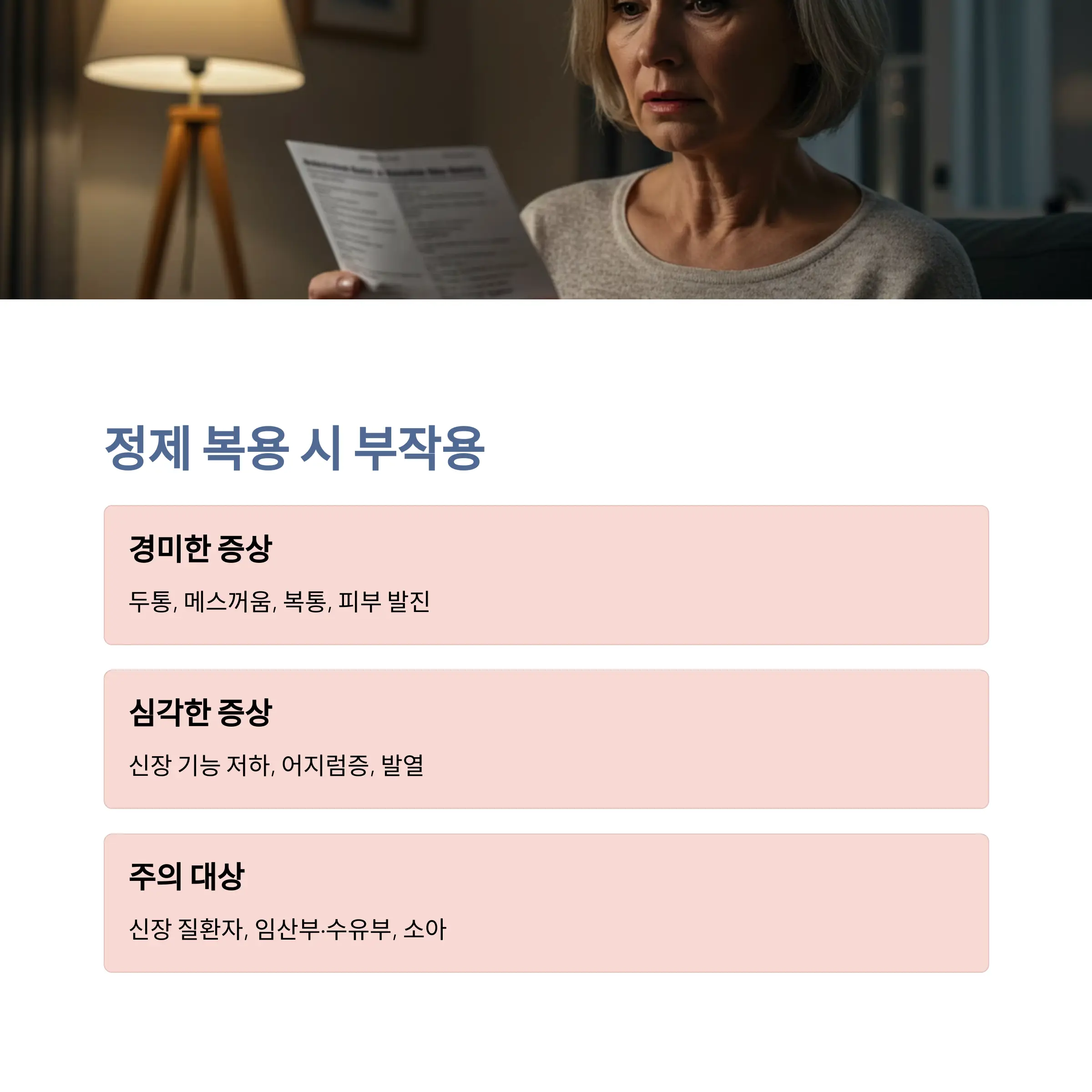 - 신장 질환자: 약 성분이 신장을 통해 배출되므로 용량 조절 필수