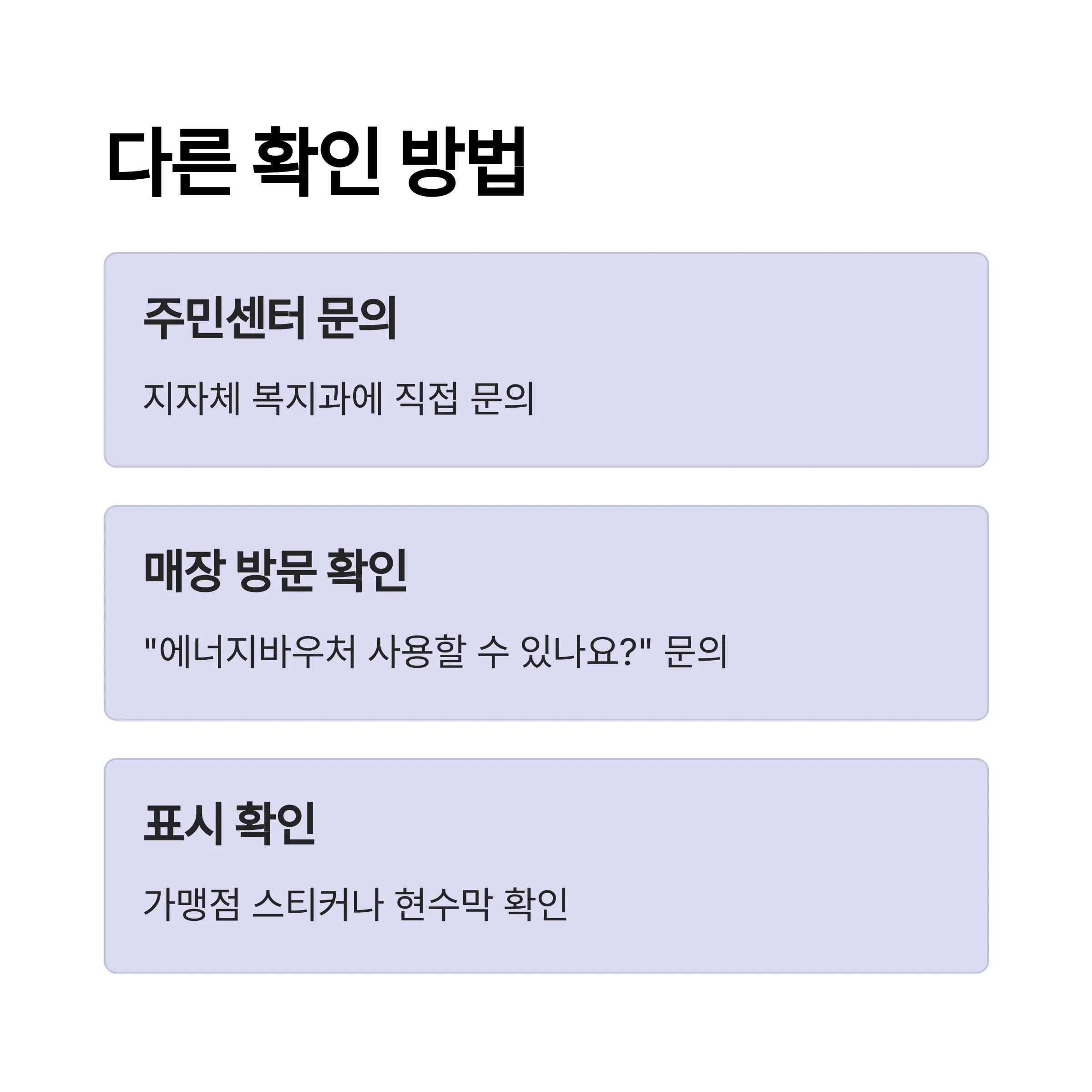 매장에 직접 방문할 때는 “에너지바우처 사용할 수 있나요?”라고 문의해보는 것이 안전합니다. 매장 내부에는 ‘에너지바우처 가맹점’ 스티커나 현수막이 붙어 있는 경우도 많습니다.