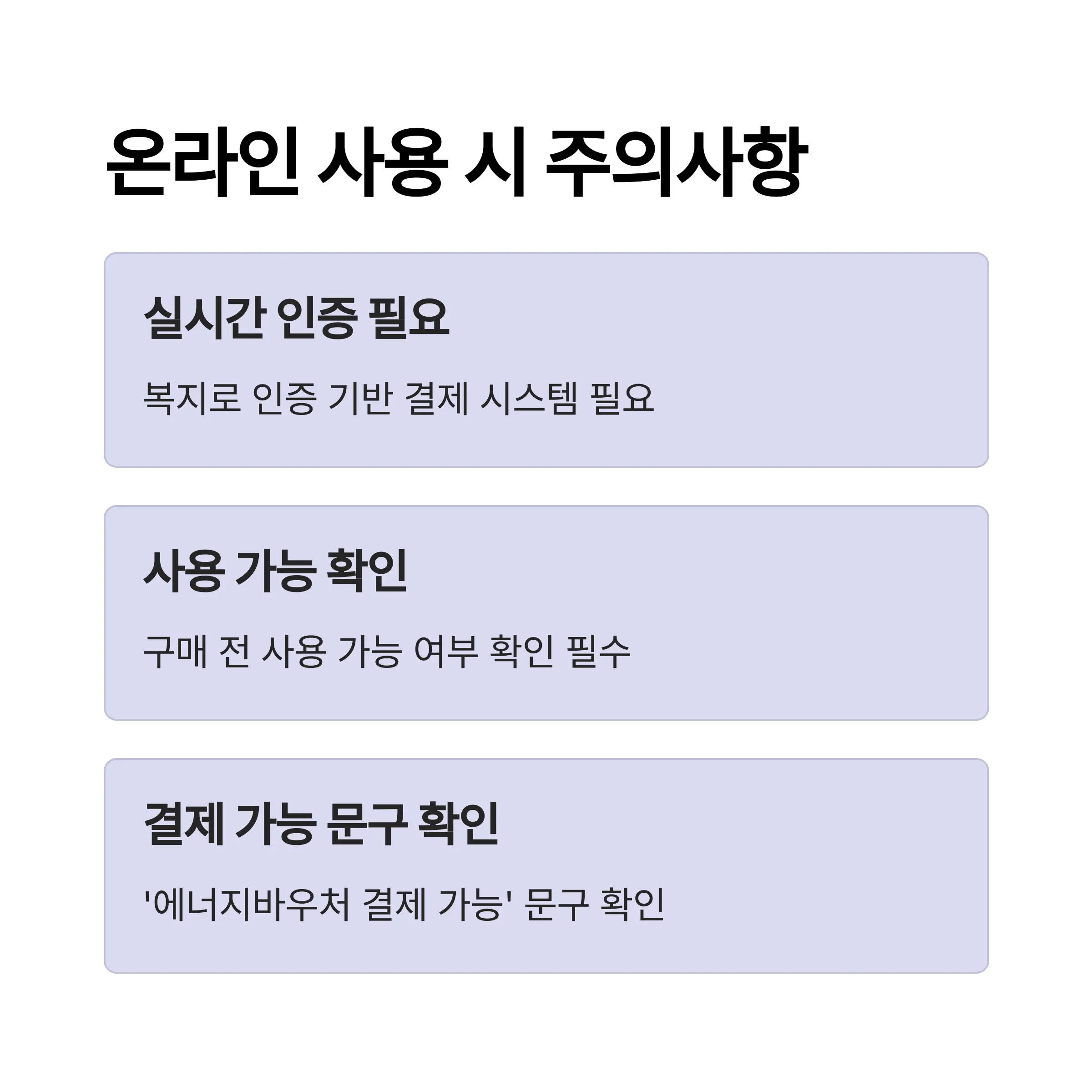 단, 온라인 사용은 실시간 인증이 필요하며, 구매 전 반드시 사용 가능 여부를 다시 확인해야 합니다. 상품 설명에 ‘에너지바우처 결제 가능’ 문구가 없다면 결제가 거부될 수 있습니다.