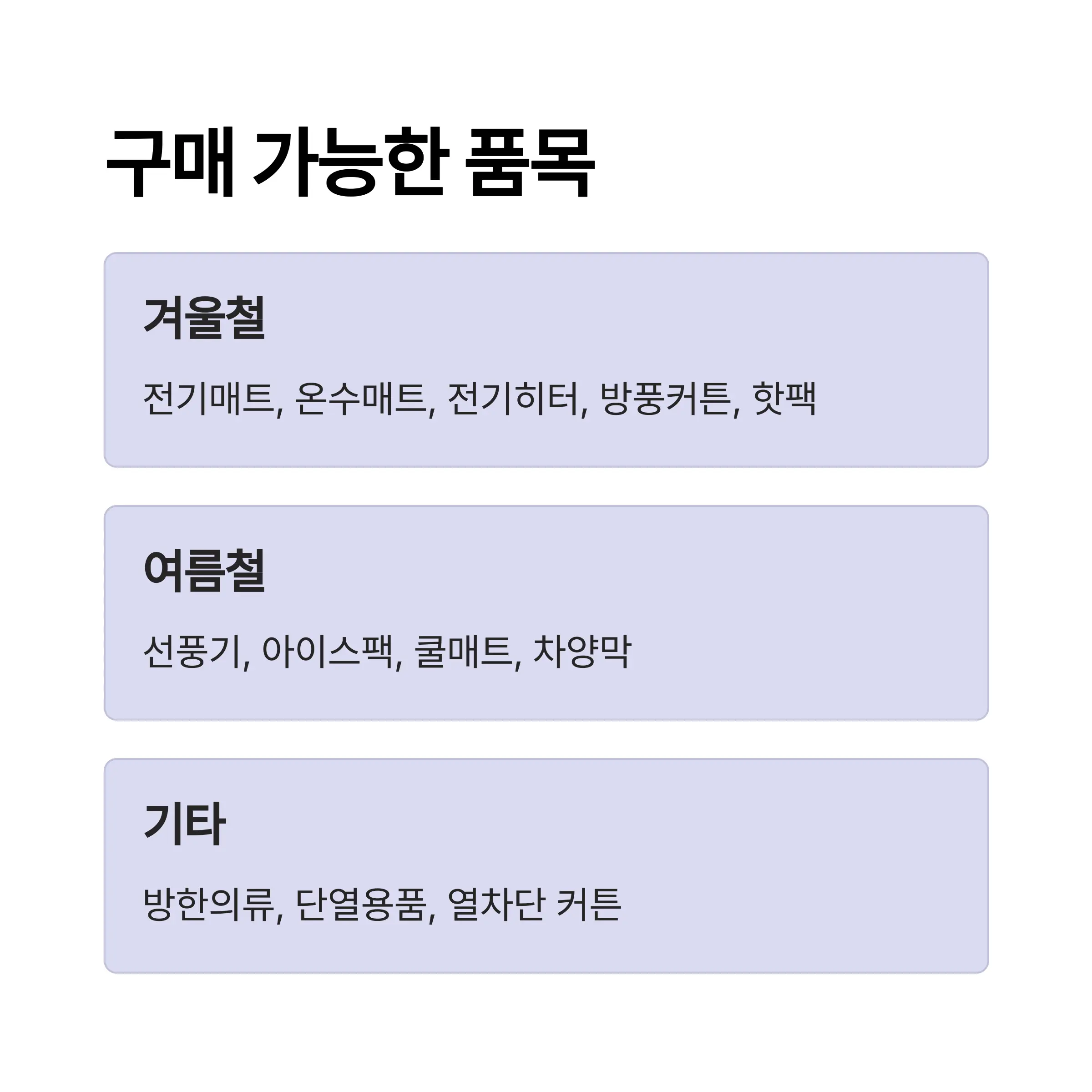 - 겨울철: 전기매트, 온수매트, 전기히터, 방풍커튼, 핫팩 등