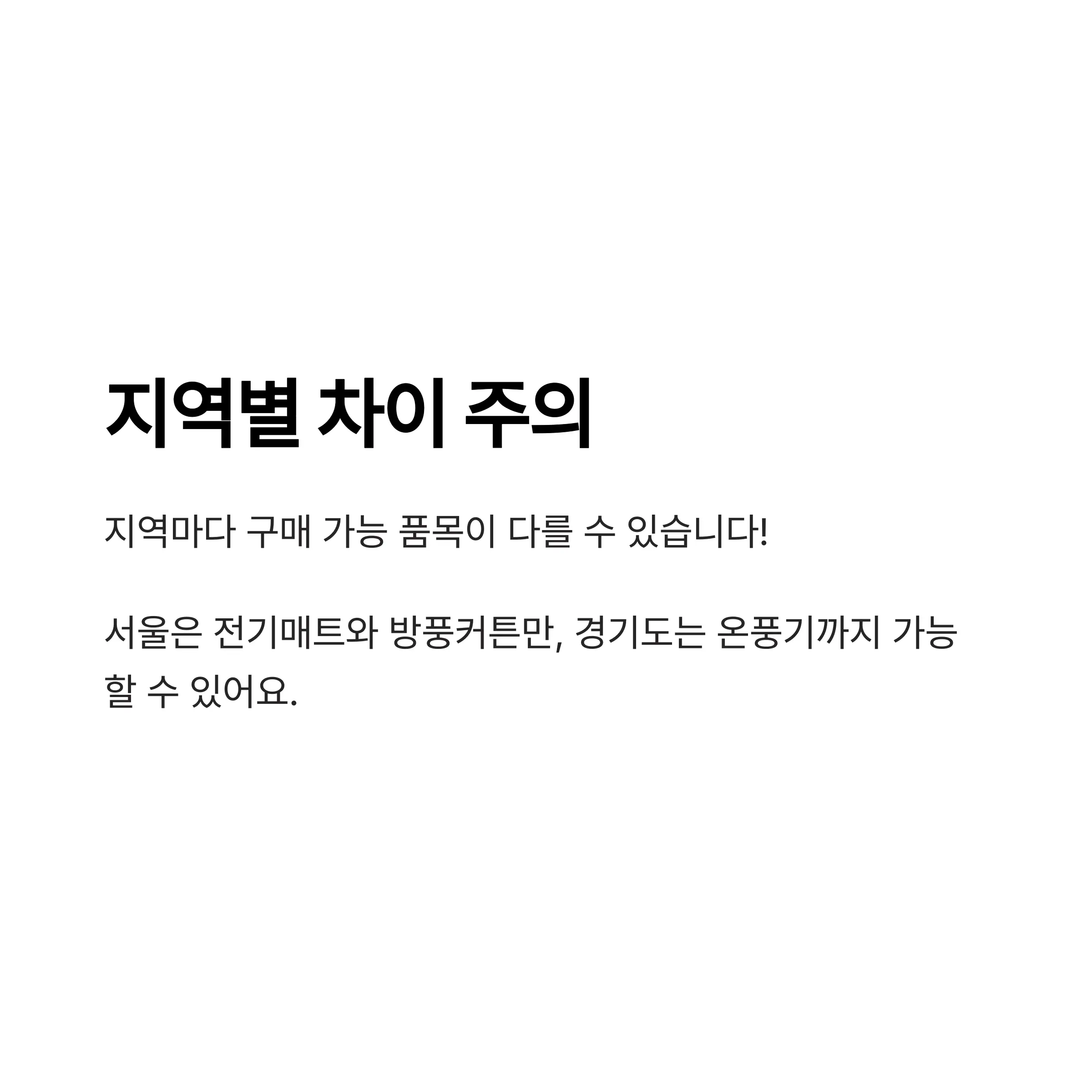 단, 모든 품목이 다 허용되는 것은 아닙니다. 예를 들어 서울시는 전기매트와 방풍커튼만 허용할 수 있지만, 경기도는 온풍기까지 가능할 수 있어요. 따라서 반드시 지자체에 문의하거나 복지로에서 허용 품목 리스트를 확인해보는 것이 필요합니다.
