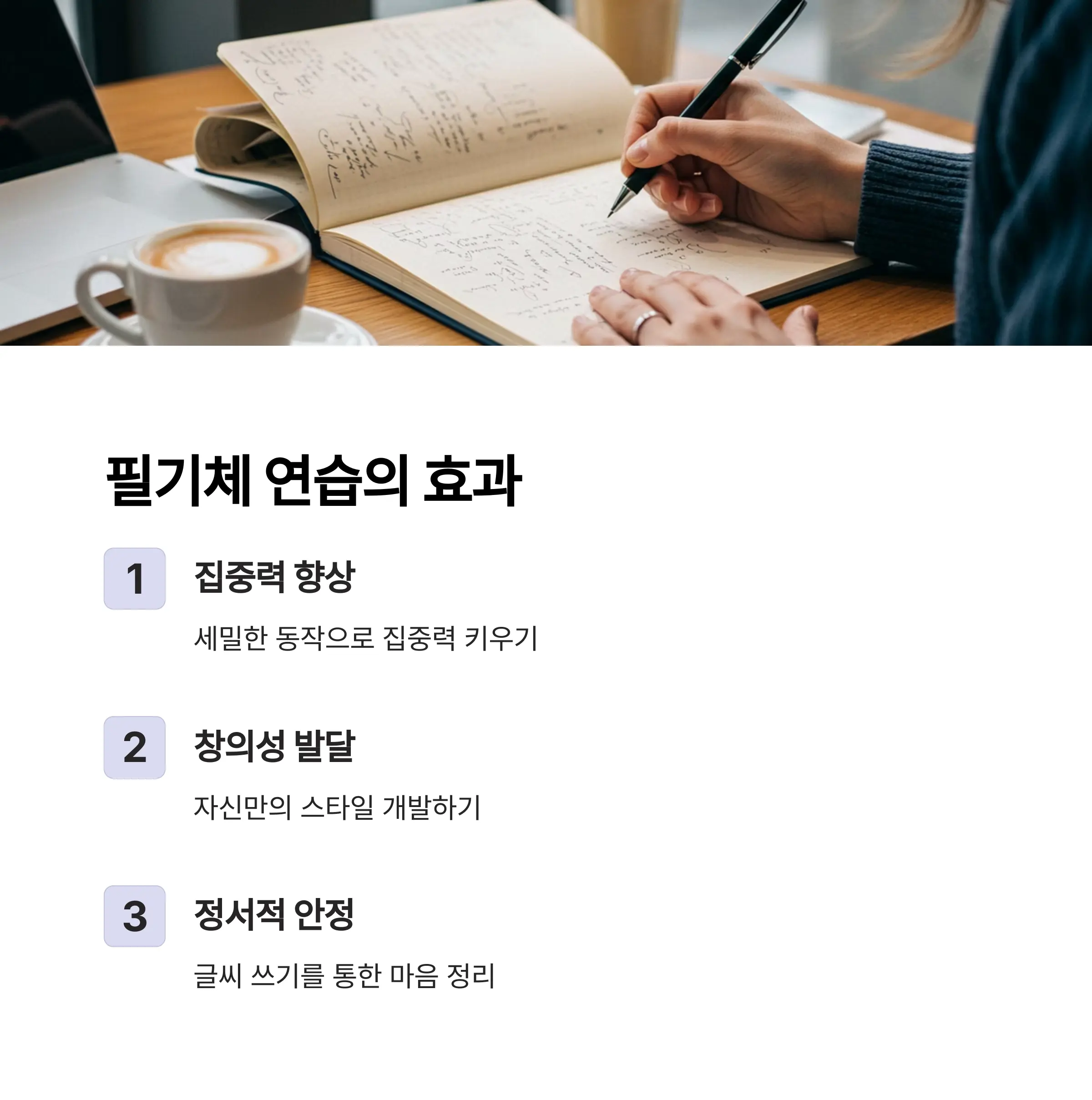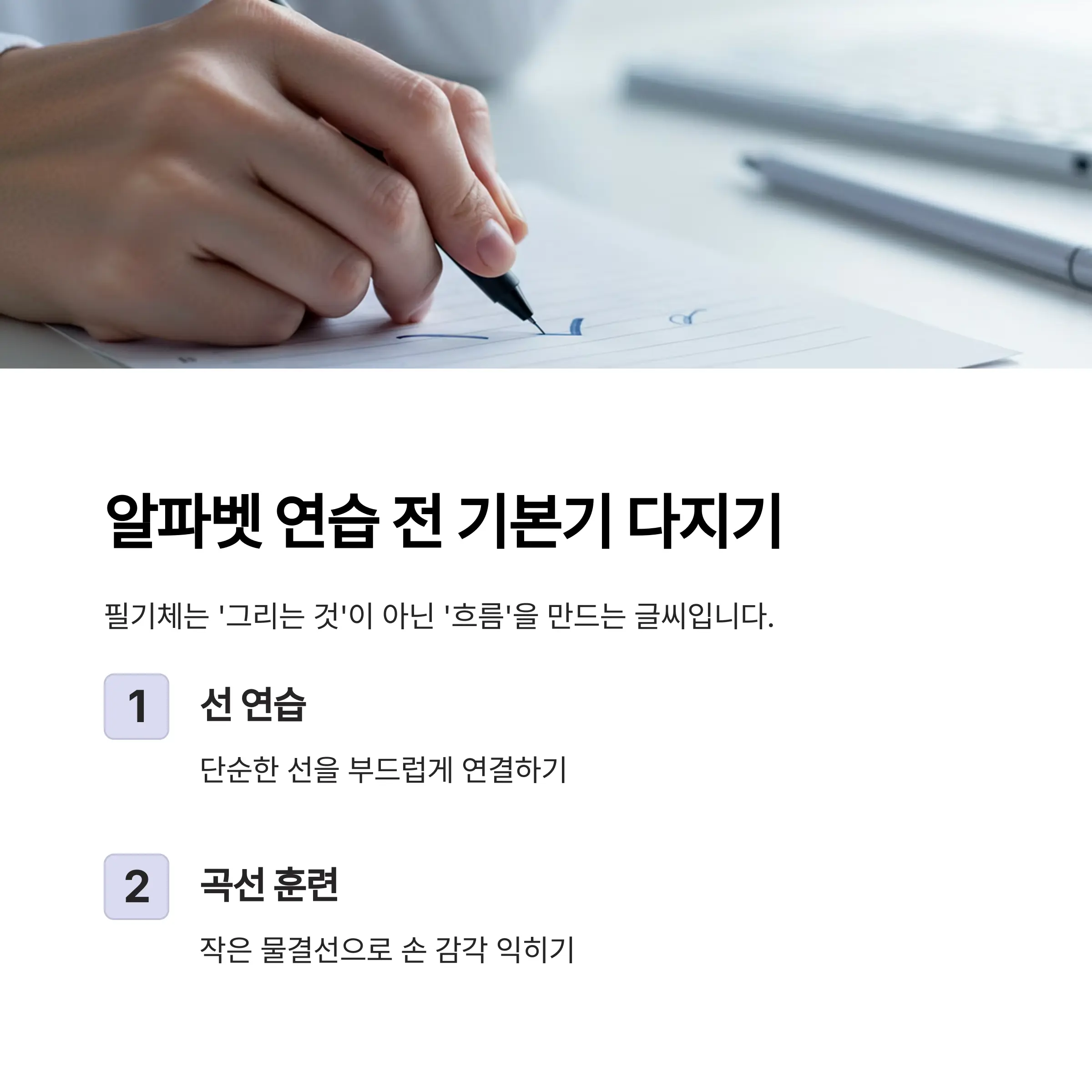 손목이 편안하고 종이가 밀리지 않는 환경을 만들면 연습 효과가 훨씬 좋습니다.