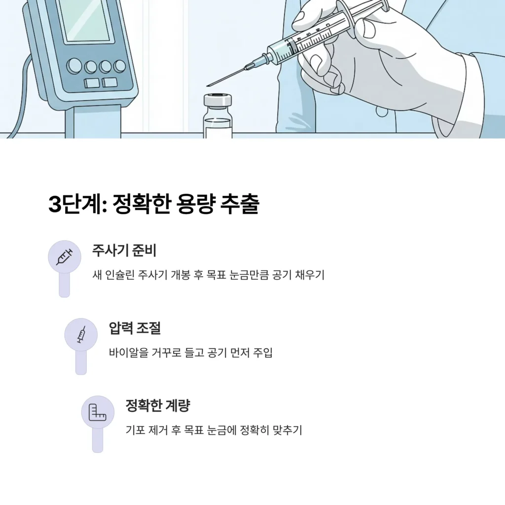- 환산표에서 찾은 목표 눈금(예: 8유닛)만큼 주사기 피스톤을 당겨 공기를 채웁니다.