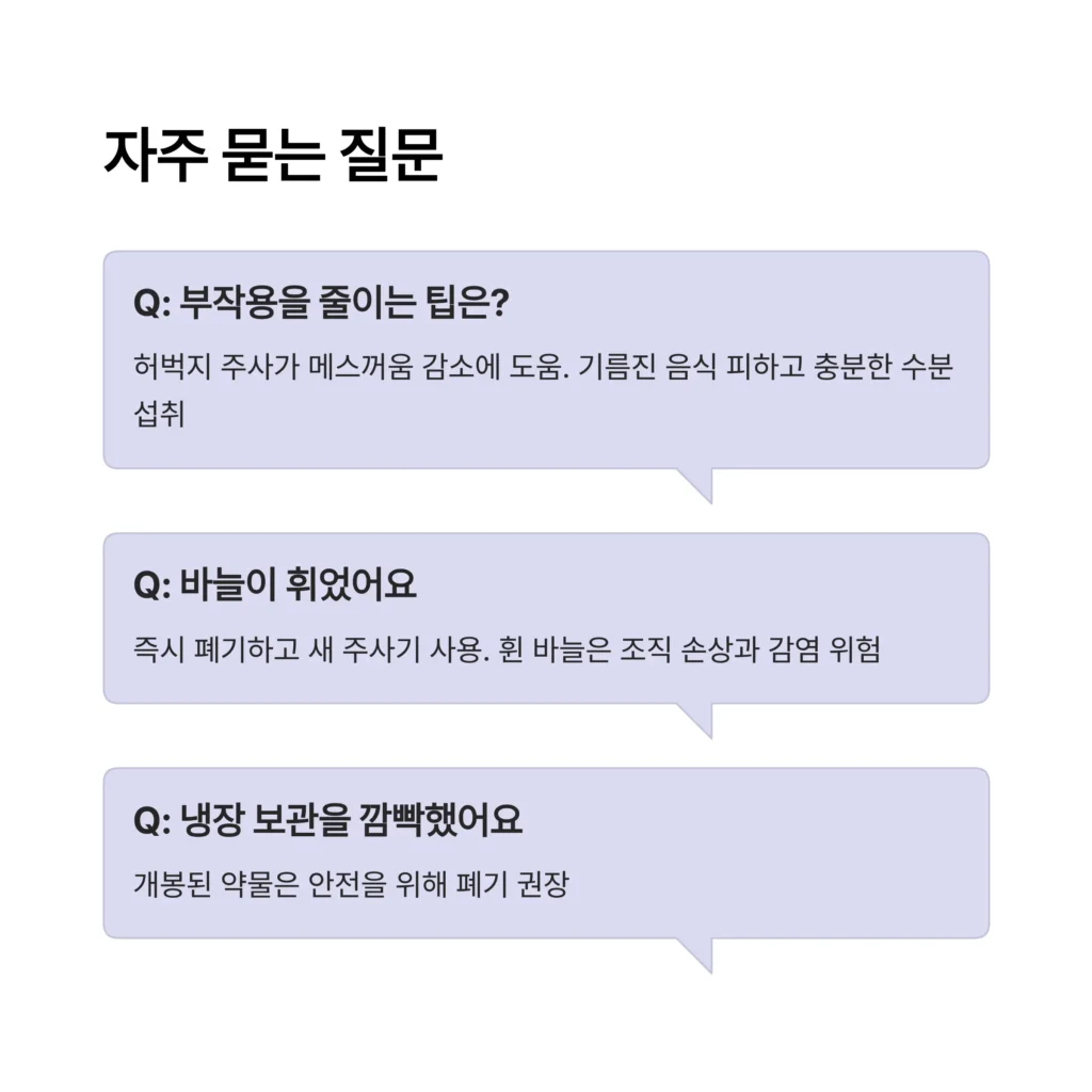 A: 네 있습니다. 주사 부위를 복부 대신 허벅지에 놓으면 메스꺼움이 줄어든다는 경험담이 많습니다. 또한 주사 맞기 전후로 기름진 음식을 피하고 물을 충분히 마시는 것이 도움이 됩니다.